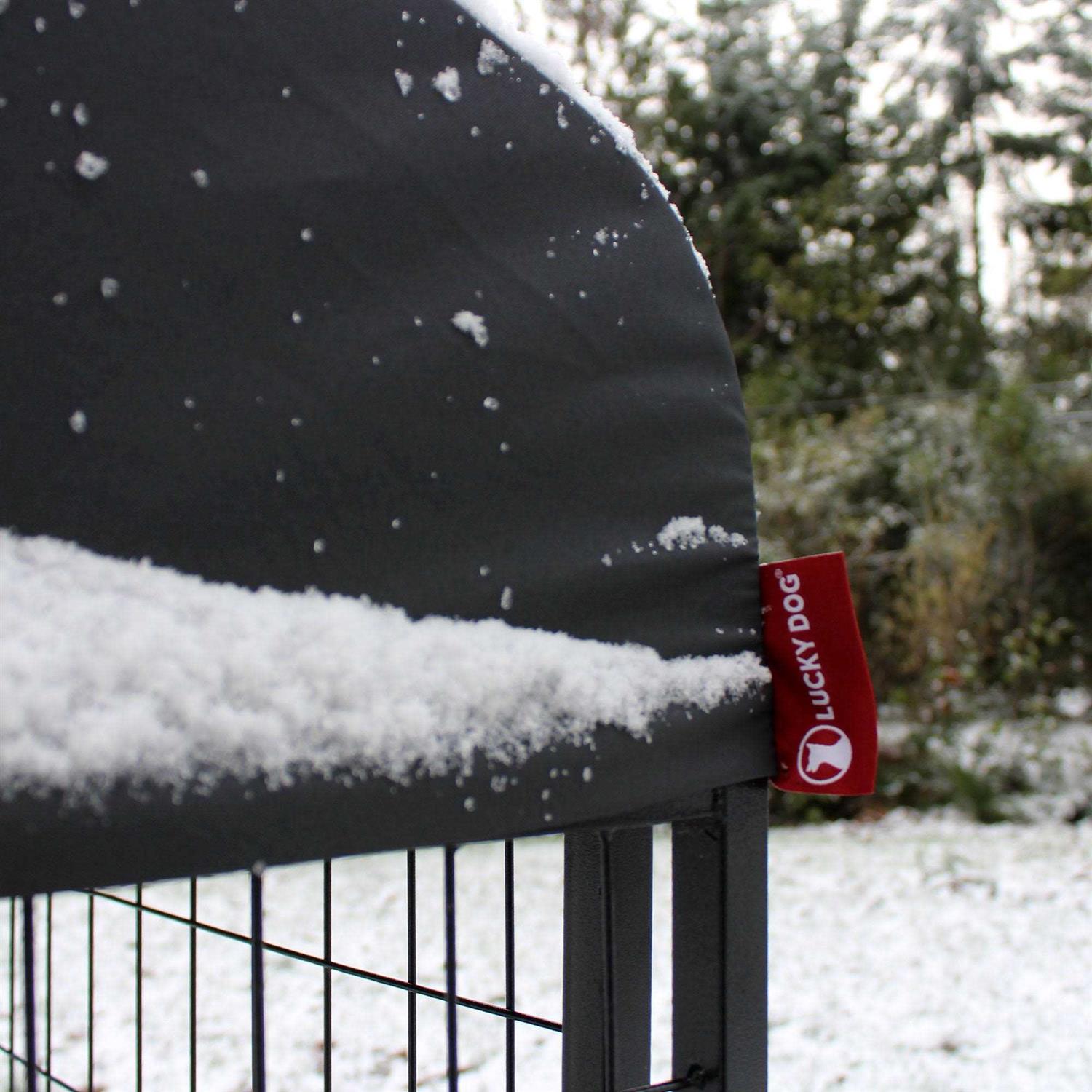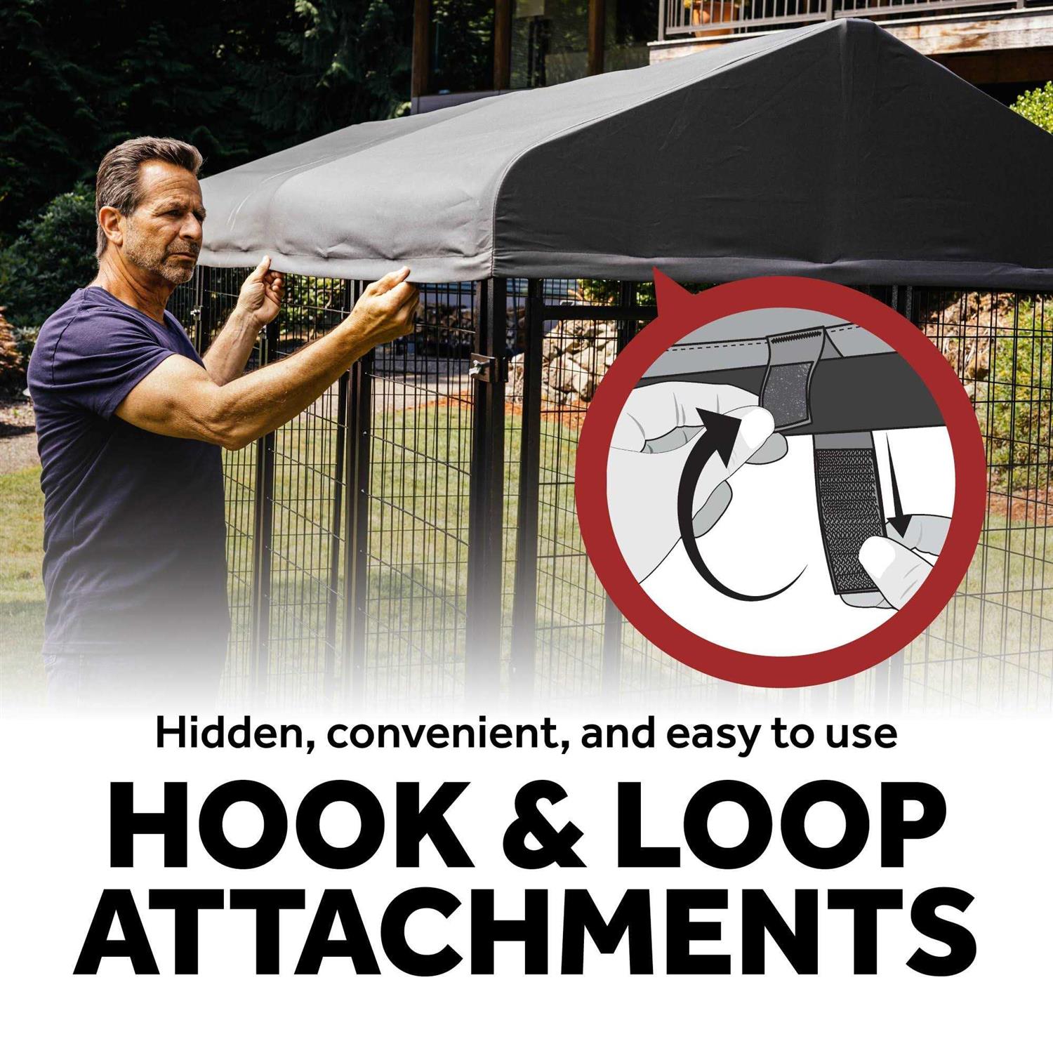 Give your dog the very best. With sleek style and durable design, the Lucky Dog STAY Series Kennel is built with a long-lasting frame and premium roof cover. An all-steel frame features a powder-coat finish that delivers a strong and protected setting for your animal. The waterproof polyester cover offers UPF 50-plus protection and is designed for ultimate comfort. Featuring a premium style that will compliment any yard, the cover includes hidden hook and loop attachments. Easily keep your pup’s home clean by simply removing the roof cover and by wiping off any dirt or debris. This studio dog kennel features a straightforward, no tool assembly so that you have more time to play with your family pet. Measuring 4 x 4 x 6-foot with a door opening of 18.5 x 52.5 inches this kennel has ideal space for your dog. Designed to provide your pet with comfort and protection, the Lucky Dog STAY Series Kennel delivers quality and luxury in one.