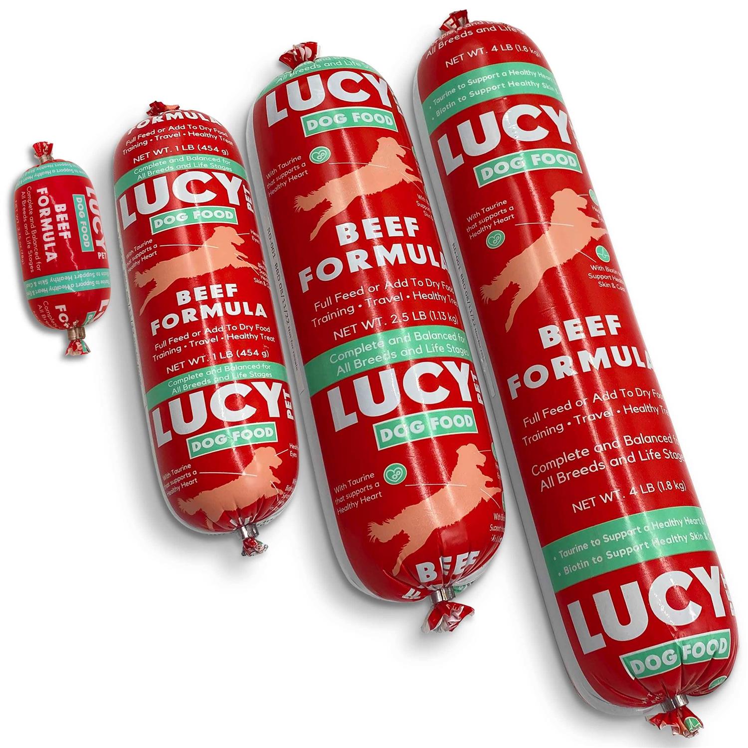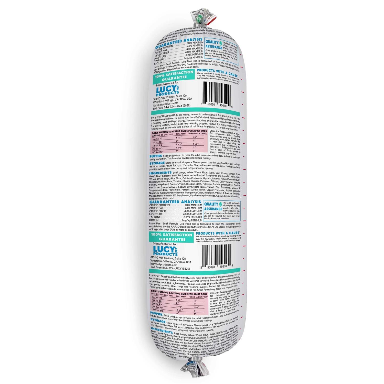 Lucy Pet Dog Food Rolls are premium dog food rolls formulated for optimum nutrition, a healthy coat, and high energy. Complete and balanced for all life stages from puppies to adults. You can slice or chop to use as a full feed or a treat, or grate and use as a food topper! Available in 4 lb, 2.5 lb, 1 lb, and 2.75oz sizes Perfect for travel with your dog, ideal for senior or convalescing dogs, and great for hiding medications. Semi-moist, meaty beef formula that even the pickiest dogs will love! With biotin to support healthy skin & coat and added taurine for heart and eye health Easy to use- no refrigeration needed until opened. Store unopened rolls in your pantry.