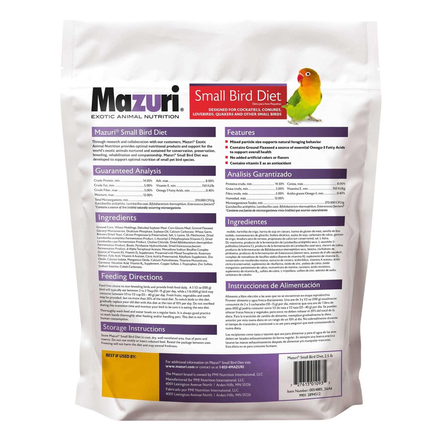 Mixed particle size. Supports natural foraging behavior. Contains ground flaxseed. Source of essential omega No artificial colors or flavors. Contains vitamin E as an antioxidant. Mazuri Small Bird Maintenance Diet is a complete bird food for small psittacines and passerines. This nutritionally complete small bird food, formulated in multi-sized particles, can be used as the primary diet for nonbreeding birds.