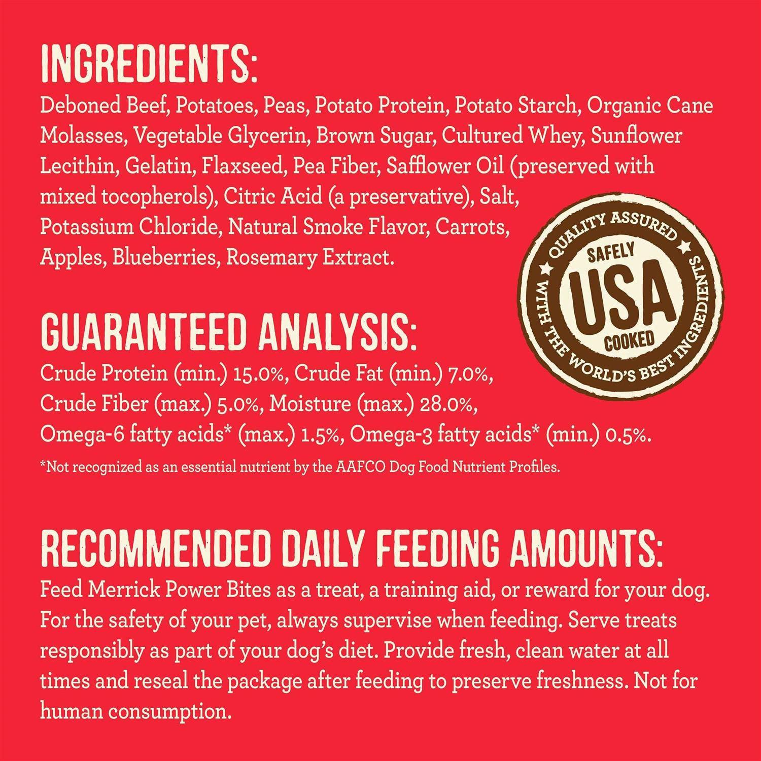 Merrick Power Bites are flavorful, power-packed treats with big taste in every bite and perfect for training and rewarding your dog. With industry leading levels of protein in every bite, Merrick Power Bites are unmatched in good-for-you quality and taste. Real deboned meat is the No.1 ingredient and single source of protein for a tasty morsel with added nutrition from wholesome veggies and fruits. Our first five ingredients are real deboned meat, potatoes, peas, potato protein and potato starch. Unlike most soft and chewy treats, Merrick Power Bites are all-natural, grain free and gluten free with no corn, no soy, no wheat and no sorbic acid. Merrick Power Bites are made in the USA with limited ingredients and contain No Ingredients from China. Reward your active pal with naturally nutritious and powerfully delicious Merrick Power Bites.