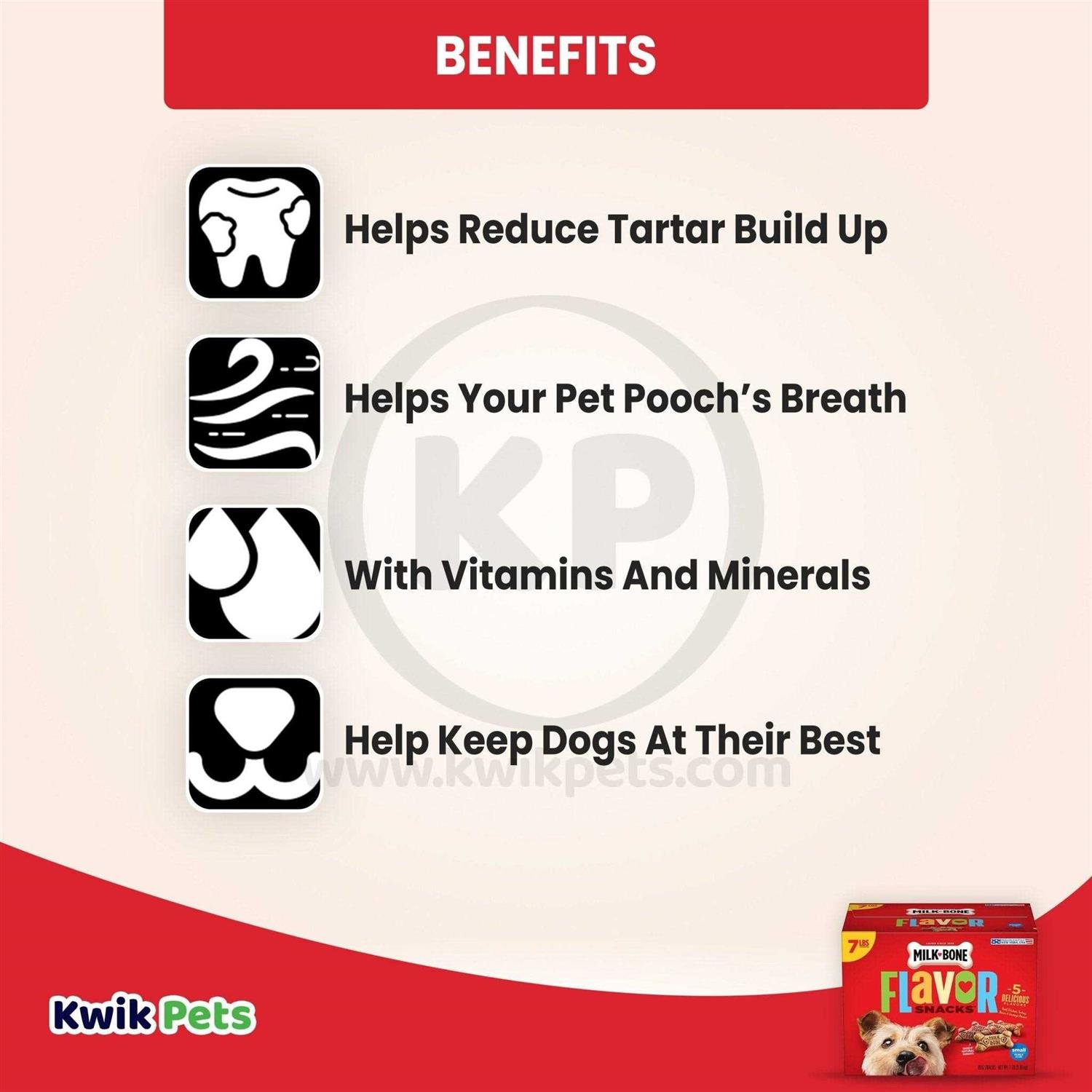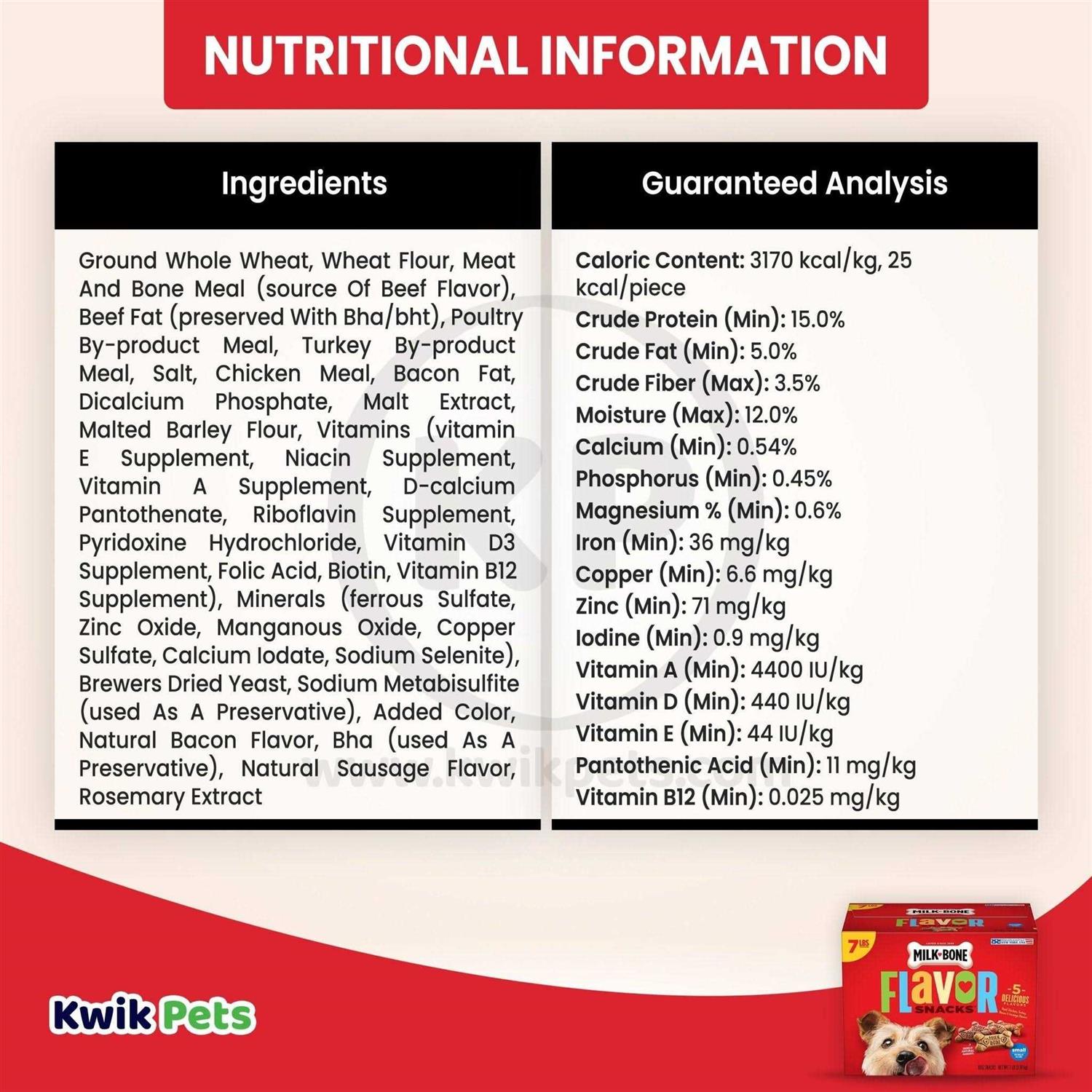 These Milk-Bone dog snacks, 5 flavor treats are a healthy option for your furry friend. These healthy dog snacks for small and medium dogs contain 12 vitamins and minerals for nutrition. Milk Bone dog biscuit treats, in a 7 lb variety pack, include five flavors. Entice your dog with bacon, beef, vegetable, peanut butter and chicken dog treats for a variety of flavor.