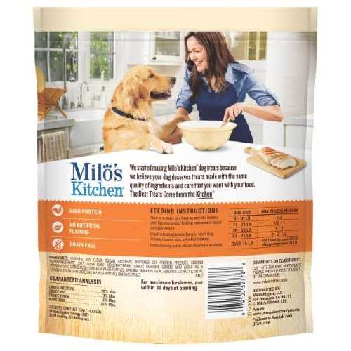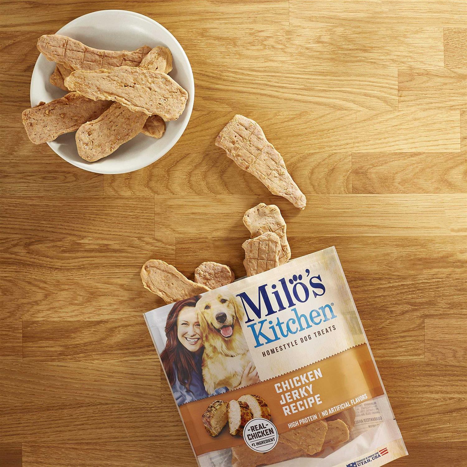 - Contains one 15-ounce bag of milo’s kitchen chicken jerky strips dog treats