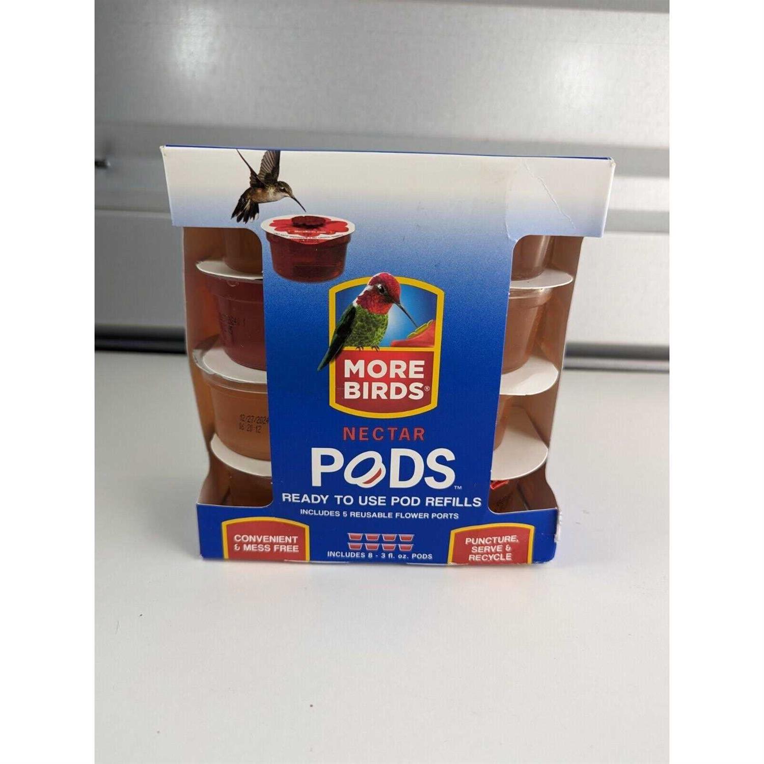 The More Birds Nectar Pods refills are an essential component of your Wireform or Gemini Hummingbird Feeders. The ready-to-use pods are pre-filled with nectar, making them a convenient, mess-free way to feed hummingbirds. Simply load pods into your compatible pod base (sold separately) and puncture the foil with a reusable flower port. More Birds Nectar Pods are a revolutionary way to feed hummingbirds. They require almost no maintenance while being kind to hummers’ environment. The single-use pods are 100% recyclable and eliminate the need to clean and refill feeders. When they are empty, recycle the empty pods and replace with new ones. The natural red nectar is free of artificial dyes and mimics the real flower nectar hummingbirds feed from in nature. With eight (8) 3oz nectar pods in each box, there will be plenty of nectar to go around. More Birds is the original single-use nectar brand, making hummingbird watching as a hobby easier, cleaner, and more enjoyable!