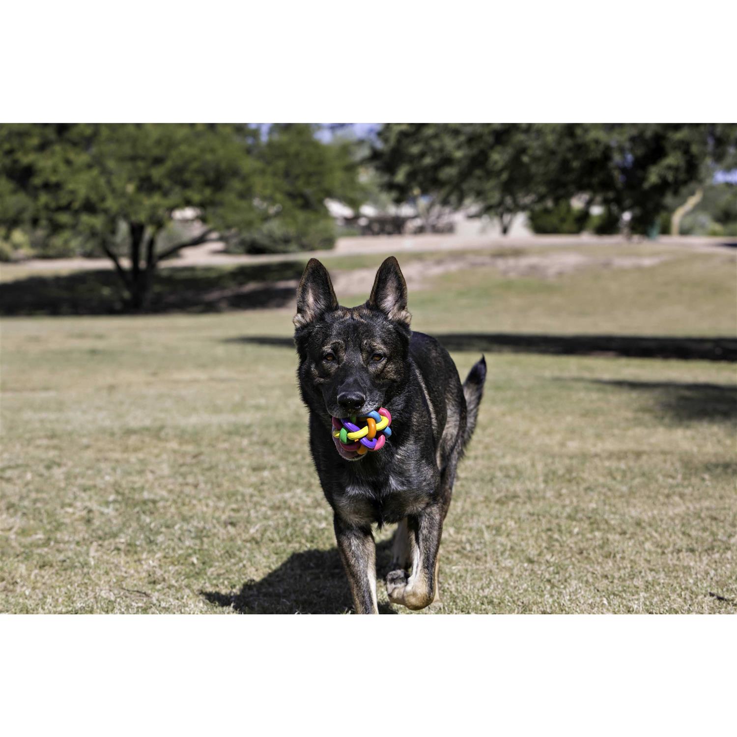 Your dog will love playing with this nobbly-wobbly, entwining rubber dog toy. It is made of extra-tough rubber, interlaced to form heavy rubber balls. The result is a groovy shape that bumbles, bounces and rolls. You’ll love the bright rainbow of colors in each ball. Small is 3″. Large is 4″. Made of extra-hard rubber for durability. Great for small and large dogs.