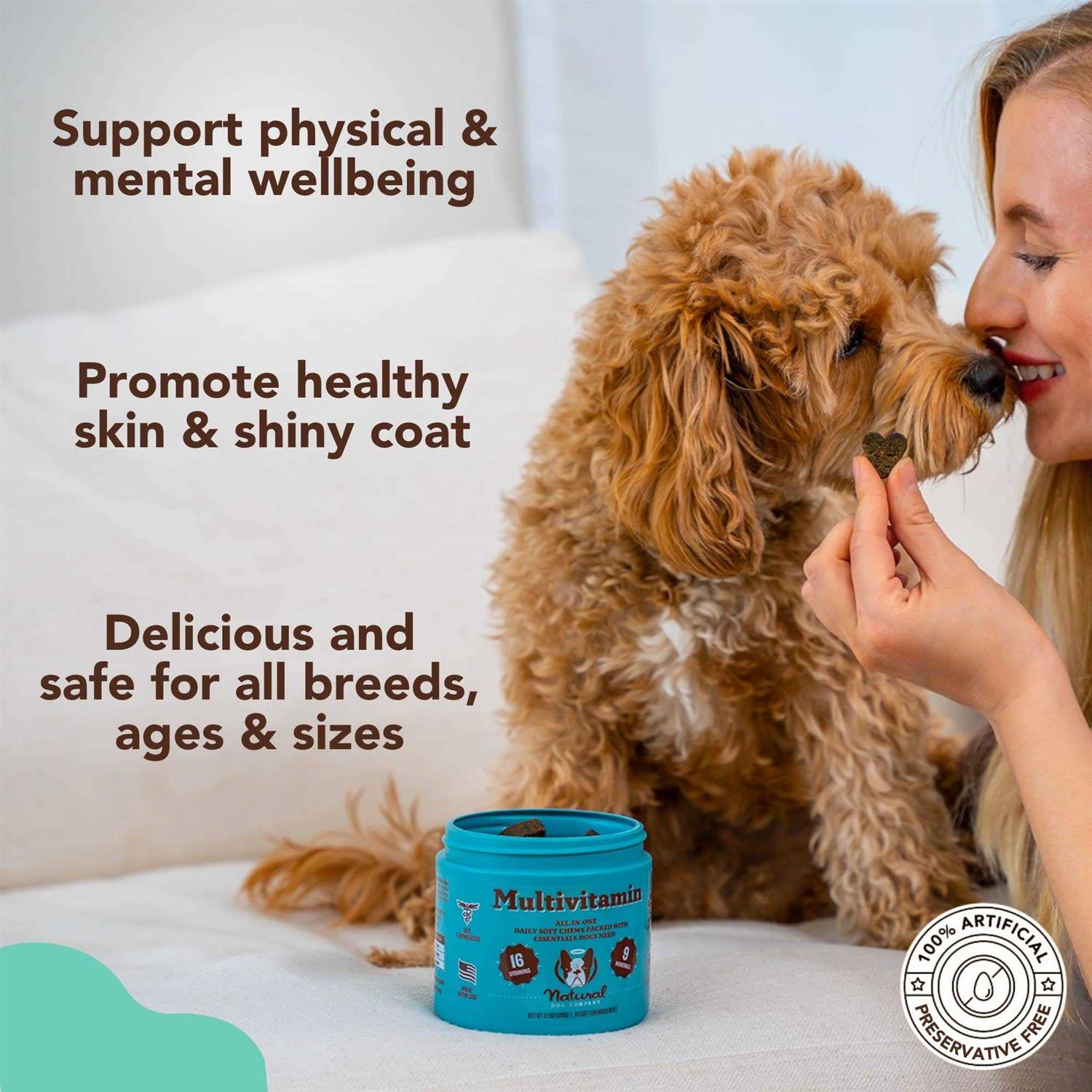 Looking for a supplement that does it all? These tasty Multivitamin Bites are vet-formulated with an all-in-one blend of natural and essential vitamins, minerals, and nutrients to provide daily nutritional support for the dog(s) you love. Help keep your pup in peak condition by maintaining their overall physical and mental well-being. Packed with 25 Individual Vitamins and Minerals to support all-around good health for dogs of all ages and breeds. A scientifically balanced formula for daily support that is easy to digest. Our multivitamin chew is a delicious duck and sweet potato flavor that your dog will love and is soy, grain, and corn-free. Please consult your Vet before giving your dog a new supplement. Supports Well-Rounded Health with a nutrient dense formula Helps regulate energy, support joint health, and improves skin & coat health Scientifically based formula rich in vitamins and minerals for optimal health Vet approved for all breeds, sizes, and ages and made in the USA. Use dosage chart for recommended portion for your dog.