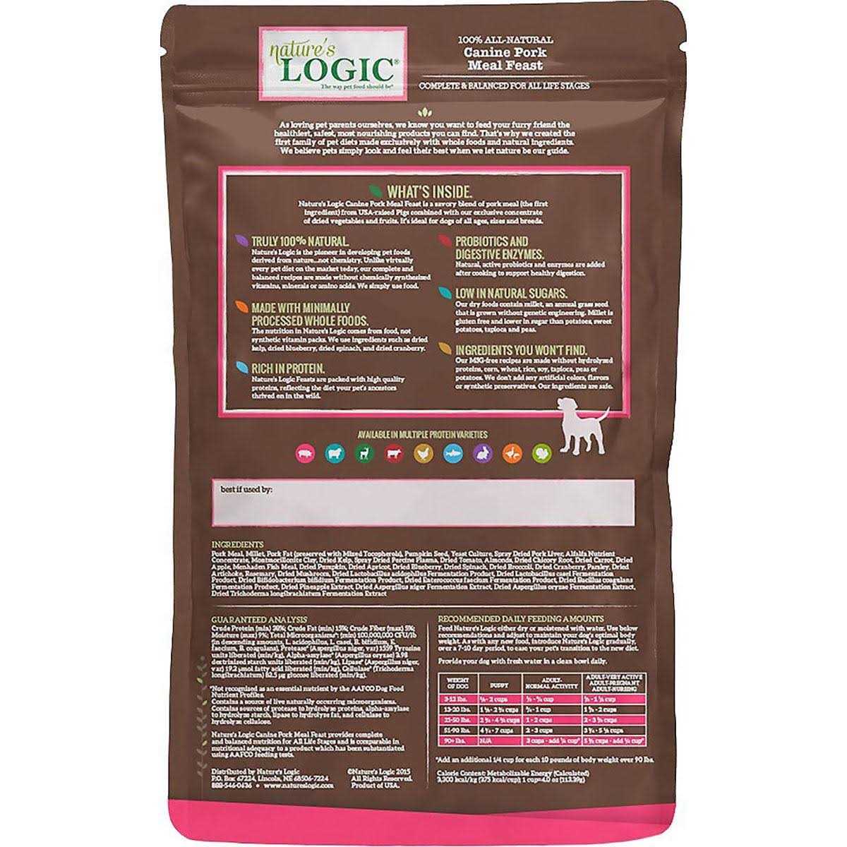 Natures Logic Pork Meal Feast is a 100% natural, highly palatable and nutrient rich dry dog food featuring high-quality, high-protein pork meal from USA-raised pork as the first ingredient. The diet features concentrates of select fruits and vegetables and the kibble is specially coated with digestive enzymes and plasma protein containing high levels of natural vitamins, minerals and albumin and globulin proteins. Plus, its made without the use of potatoes, peas, lentils, wheat, corn, rice, soy, potato or chemically synthesized vitamins, minerals, trace nutrients, carrageenan, guar gum or xanthan gum. 100% natural formula made free of chemically synthesized vitamins, minerals or amino acids. Plus, the kibble and packaging are produced with 100% renewable electricity. Contains minimally processed food, such as dried kelp, blueberries, spinach and cranberries. Probiotics and digestive enzymes added after cooking help maintain proper digestion. Grain-inclusive formula contains non-GMO millet, a low glycemic grass seed. MSG-free formula made free of hydrolyzed proteins, corn, wheat, rice or soy.