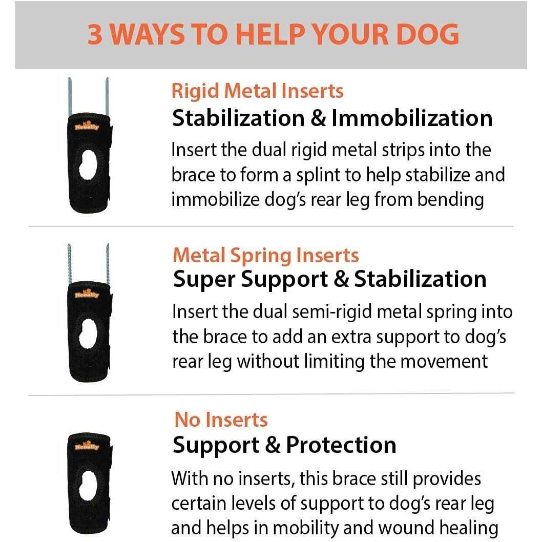 Vets Highly Recommend to Wear Pair The study has shown that when a dog gets injured in one leg, it is highly likely the other leg will get injured as well due to the imbalance caused by the injured leg. So veterinarians highly recommend wearing braces on both legs. NeoAlly package contains one pair of dog braces to support both legs. Support – Stabilize – Immobilize Each NeoAlly Dog Hock Brace comes with 2 sets of strip inserts, the rigid metal strips, and the semi-rigid metal spring strips. They are removable and interchangeable. You can easily take them out or re-insert them. The rigid Metal Strips provide stabilization and immobilization, used in dog rehab and injury recovery; the semi-rigid Metal Spring Strips provide strong support to a dog’s rear leg and hock joints, while not hindering the dog’s movement; and the braces without inserts can be used for flexible support and wound healing Breathable Fabric The dog brace is made of strong, durable, and soft neoprene, which is perforated and breathable. It helps dogs to walk better and prevents them from licking wounds, effectively protecting and speeding up wound healing and pain relief.