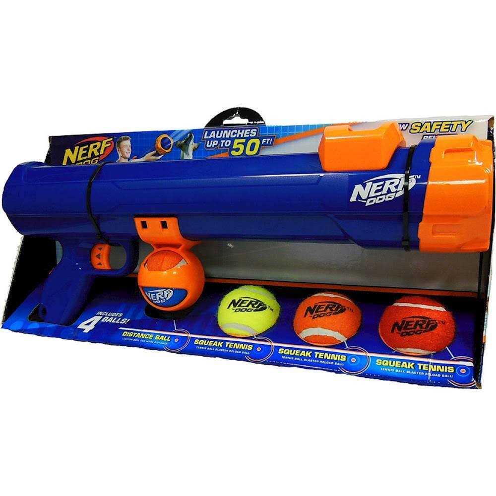 Take aim with the 20 NERF DOG Tennis Ball Blaster! This high-powered blaster launches your dogs favorite fetching tennis ball up to 50 feet in the air! Say goodbye to slobbery tennis balls! With the tennis ball blaster, you no longer have to pick up slobbery tennis balls! When your dog brings the ball back, stay in the game by placing the barrel on the tennis ball and pick it up hands-free. Skyrocket tennis balls 50 feet into the air. Reload totally hands-free, simply place the barrel over the ball. Just pull back on the handle, load the ball, and shoot. Easily change the distance of your shots and adapt to any environment. The Blaster works with standard 2.5-inch tennis balls; 4 tennis balls included.