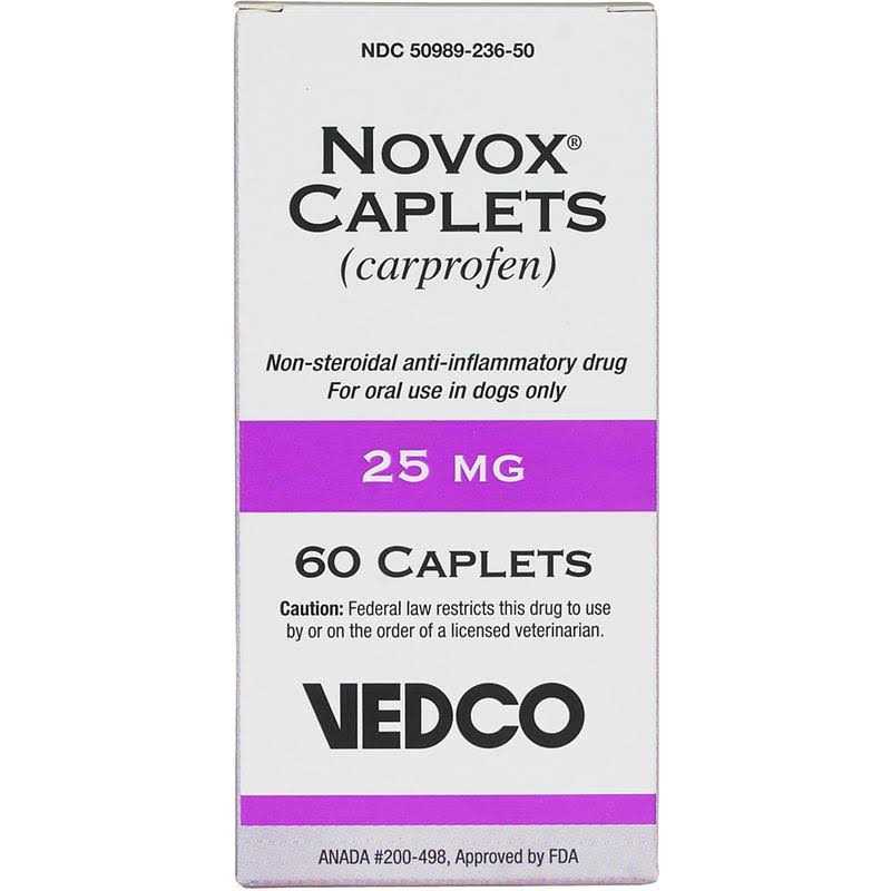 Novox Carprofen Caplets for Dogs (compares to Rimadyl) are used for the relief of pain and inflammation associated with osteoarthritis and for the control of postoperative pain associated with soft tissue and orthopedic surgeries in dogs. Novox Caplets contain carprofen. The recommended dosage of Novox Caplets is 2 mg/lb daily, given in 1 dose or divided between 2 doses daily.