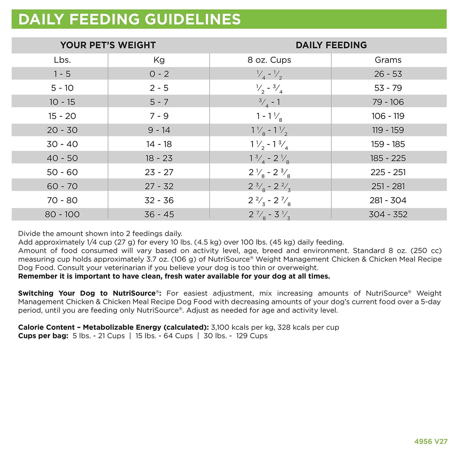 NutriSource Weight Management Chicken and Rice Formula provides super premium nutrition in a scientifically formulated easy to digest food designed for maintenance of less active adult dogs that may tend to gain weight and also for overweight dogs. Chicken is the #1 ingredient in NutriSource Weight Management dog food. Chicken is a source of high quality protein and has a rich, wholesome taste dogs love. NutriSource Weight Management formula contains 13% fewer calories and 25% less fat than NutriSource Adult. Readily available nutrients in NutriSource Weight Management dog food go to work on the inside resulting in less waste.