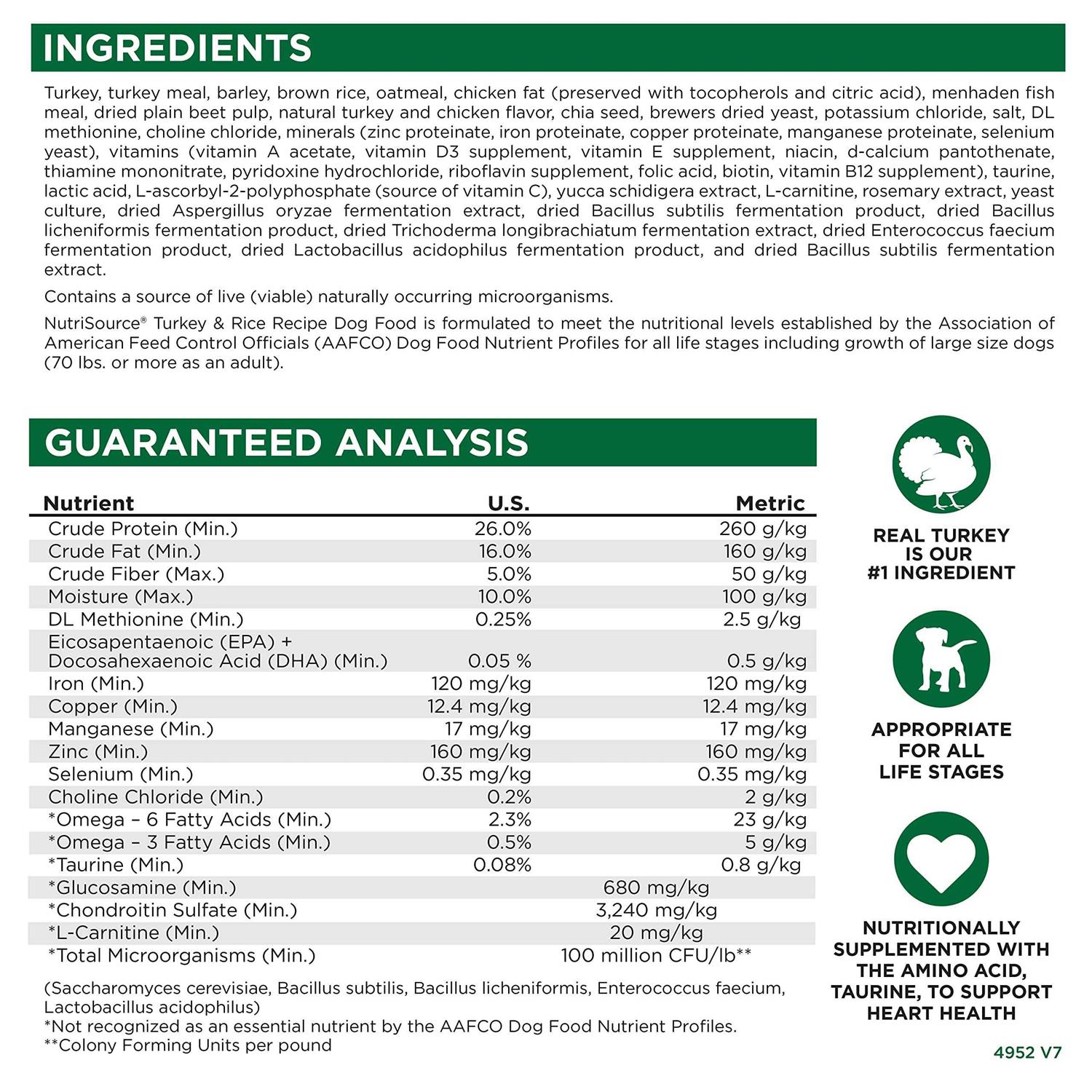 As a member of our grain inclusive series of dog foods, NutriSource Turkey & Rice Recipe is formulated to meet AAFCO guidelines for all life stages. NutriSource grain inclusive formulas deliver compact nutrition and include prebiotics and probiotics to help support a healthy gut. Balanced Omega-3 and Omega-6 fatty acids along with L-Carnitine, taurine, choline chloride and DL Methionine supplementation to promote heart health make NutriSource grain inclusive formulas stand out. NutriSource Good 4 Life System supports proper absorption of the nutrients that matter while helping to assure the pets body is adequately prepared to defend itself against infection and disease. Gut health and proper immune function are inextricably linked. Disease begins in the gut. Conversely, so does good health. Good 4 Life works from the inside out to provide perfect results.