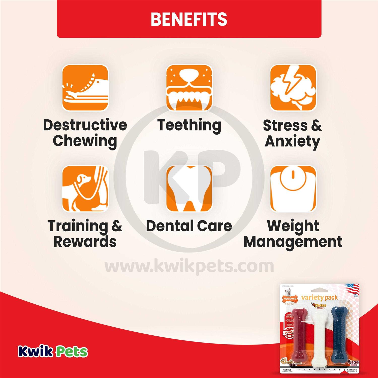 The Nylabone Dura Chew Bone Variety Pack is designed to give your powerful chewer the best chomping experience of his life Each bone has a different delicious flavor and the indestructible construction Nylabone is known for. Special nubs and ridges help clean teeth during chewing for a happy healthy doggy smile. Discourages destructive chewing Helps clean teeth Fights boredom Provides long lasting enjoyment Each 3 Count includes 1 Peanut Butter 1 Chicken and 1 Bacon bone Made in the USA. Sizing 4.25 Inch bones for dogs up to 25 lbs Important Its important to select the proper size and type of chew or toy for your dogs age weight and chewing strength. If you have more than one dog in your household select chews or toys appropriate for the largest strongest chewer. Always supervise the use of all chews and toys. Product is not intended to be eaten or ingested. If you think your dog swallowed a piece take the products away and contact your local veterinarian. Inspect before giving to your dog to make sure its whole and intact. Check frequently and replace if worn or damaged. Hand wash with warm soapy water and rinse frequently.