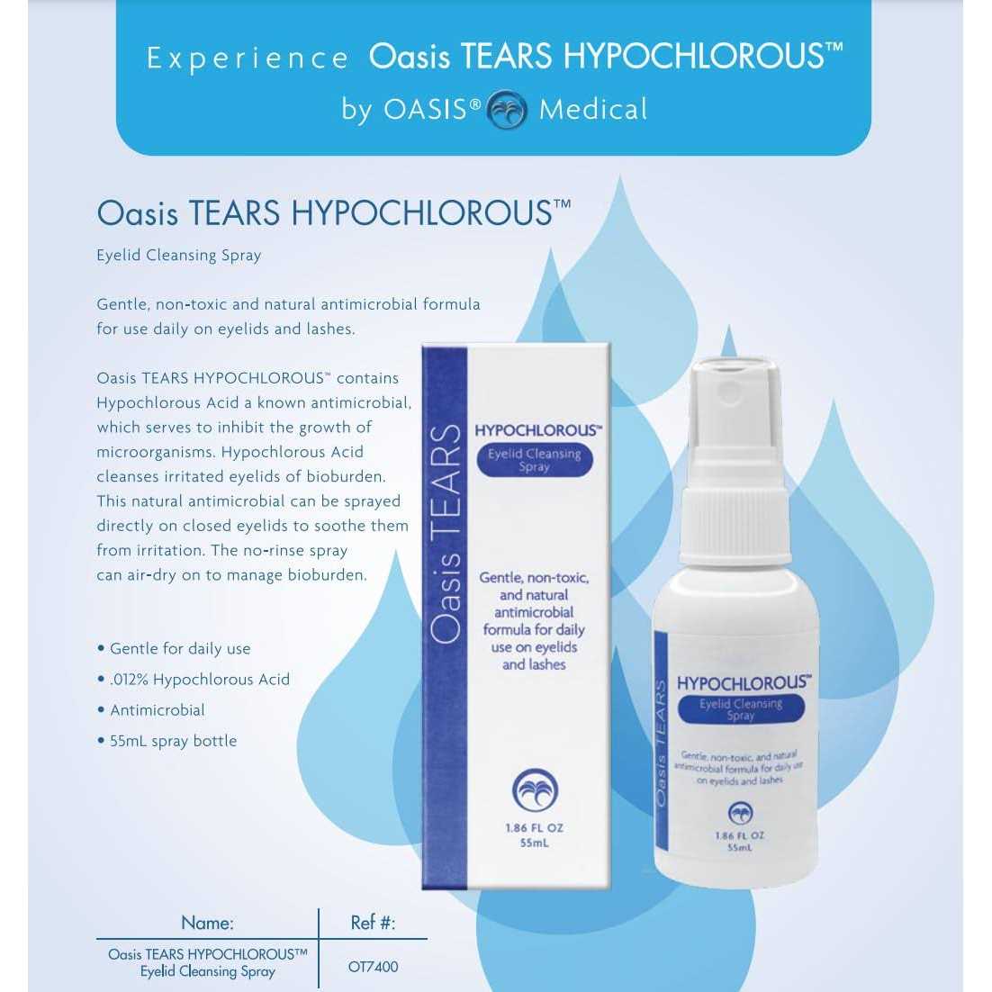 0.012% Hypochlorous Acid 55mL Spray Bottle Suitable for daily use on lids and lashes Gentle, non-toxic, anti-microbial formula for daily use Introducing Oasis Tears HYPOCHLOROUS Eyelid & Lash Cleansing Spray. Oasis Tears hypochlorous acid spray is an easy-to-use, no-touch way to clean eyelids and lashes. The convenient, portable hypochlorous spray bottle is perfect for on-the-go use or as part of your daily routine. Oasis Tears hypochlorous spray is a patented, hypochlorous acid-based formula that helps maintain healthy eyes and lashes. The spray helps remove debris, pollutants, and other irritants from the eye area, and can help relieve symptoms of dry eye, blepharitis, and meibomian gland dysfunction.