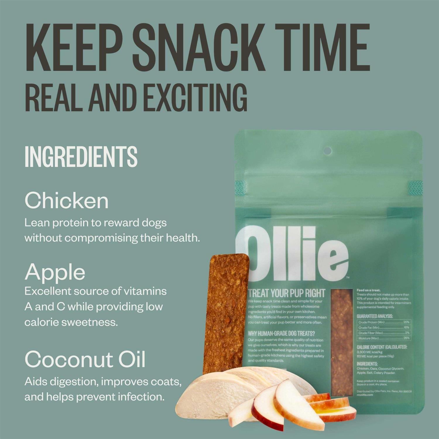 ALL NATURAL DOG JERKY: Treat your pup with clean and simple treats. Ollie Jerky is perfect for snack time or rewarding your pup for being on their best behavior. No artificial flavors or preservatives, just real ingredients! The perfect all natural dog treat. HUMAN GRADE, HIGH QUALITY INGREDIENTS: Ollie beef jerky dog treats are made in the USA in US Facilities from US and imported ingredients with human-grade, 100% all-natural ingredients. Our dog beef jerky contains only ingredients that you can pronounce. For Beef and Sweet Potato Recipe: Beef, Oats, Coconut Glycerin, Sweet Potato, Sea Salt, and Celery Powder. For Chicken and Apple Recipe: Chicken, Oats, Coconut Glycerin, Apple, Sea Salt, Celery Powder. NO PRESERVATIVES OR FILLERS: Our premium jerky treats for dogs contain no preservatives or fillers and no corn, wheat, soy, or meat byproducts. MEAT-FIRST RECIPE: At Ollie, our all natural, healthy dog treats follow a meat first recipe. This means that first ingredient on our label is Beef and Chicken respectively! Our Jerky treats are meant to be given as treats (not as meal replacements) and shouldn’t take up more than 10% of your dog’s daily calorie intake. Our Jerky comes in two flavors: Chicken and Apple along with Beef and Sweet Potato Ollie Chicken and Apple Recipe Jerky Dog Treats – Dog Jerky Treats All Natural – Healthy Dog Treats – Chicken Jerky For Dogs – Real Meat Dog Treats – For All Sizes – 5 Oz.