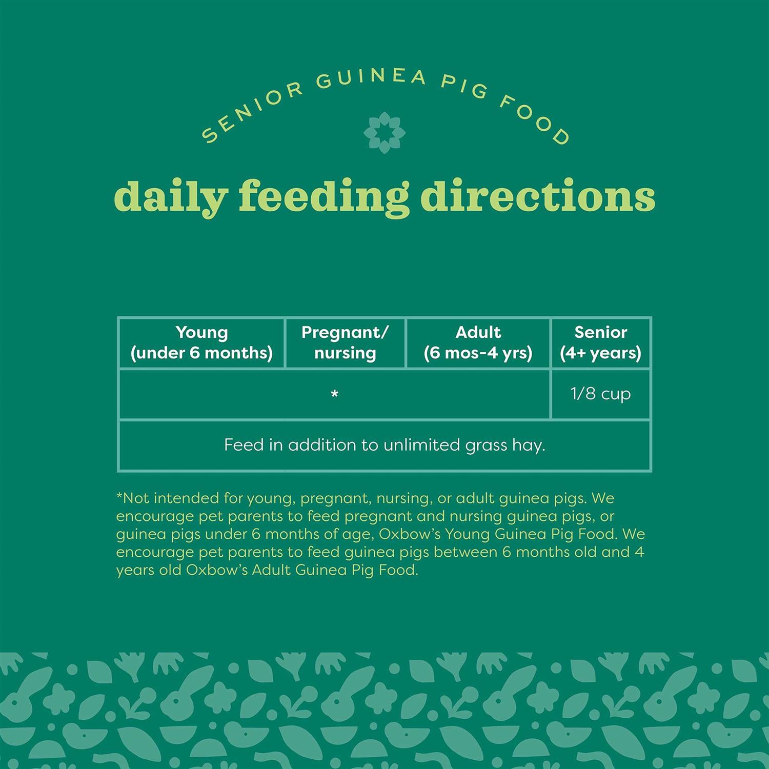 Essentials Senior Guinea Pig is specially formulated to support your aging guinea pig’s needs. Essentials Senior Guinea Pig includes natural plant-based herbal ingredients like ginger root, turmeric, and chamomile and provides 100% of your pet’s daily recommended vitamins and minerals with no artificial preservatives, colors, or flavors. From the manufacturer: Optimal daily nutrition comes from balanced meals chock full of essential vitamins and minerals in every bite that will keep your pet’s body healthy and strong. All Oxbow foods are made with purposeful, premium ingredients and are 100% uniform to prevent the unhealthy selective eating habits that come with muesli and foraging mixes and ensure complete nutrition in every bowl, every bite, every time!