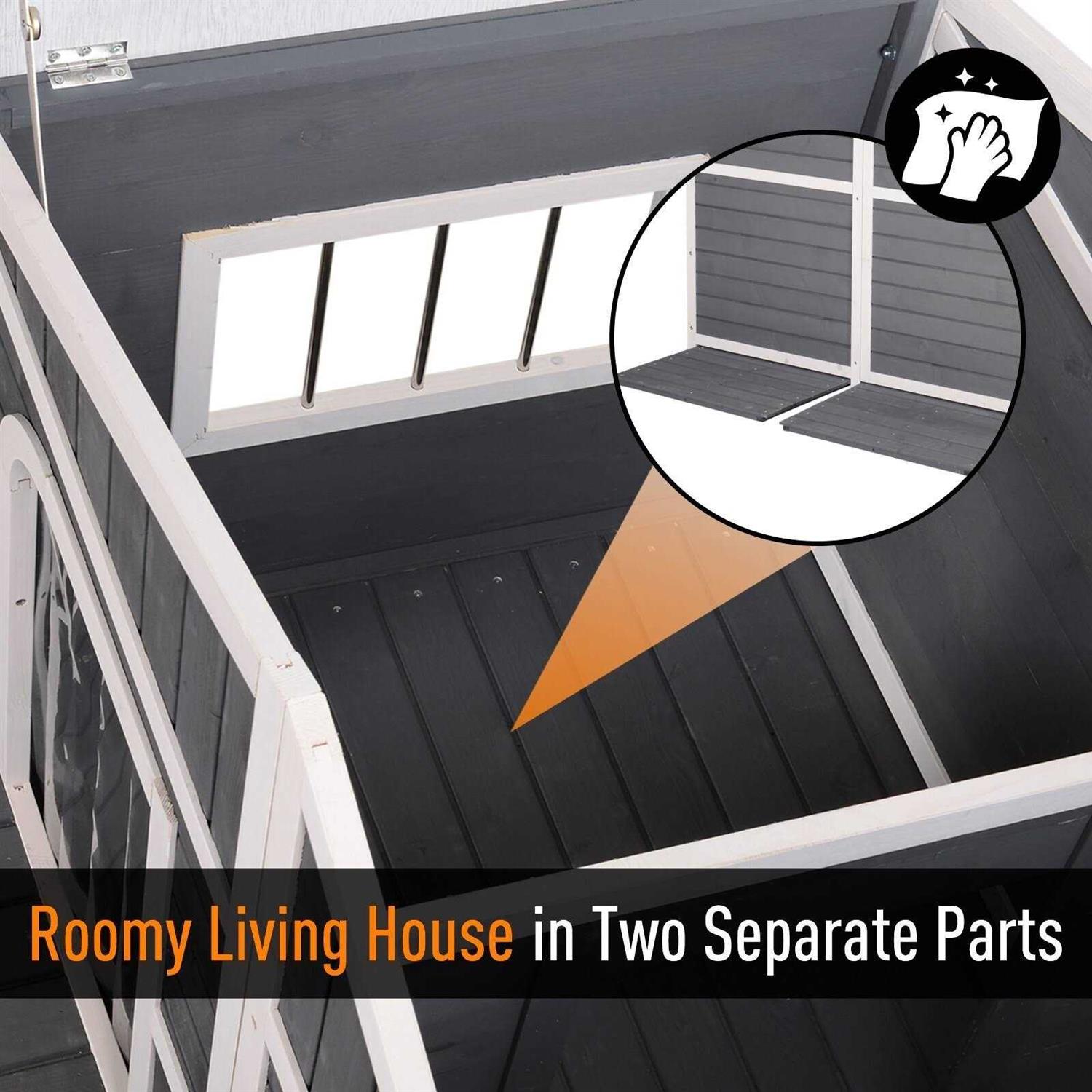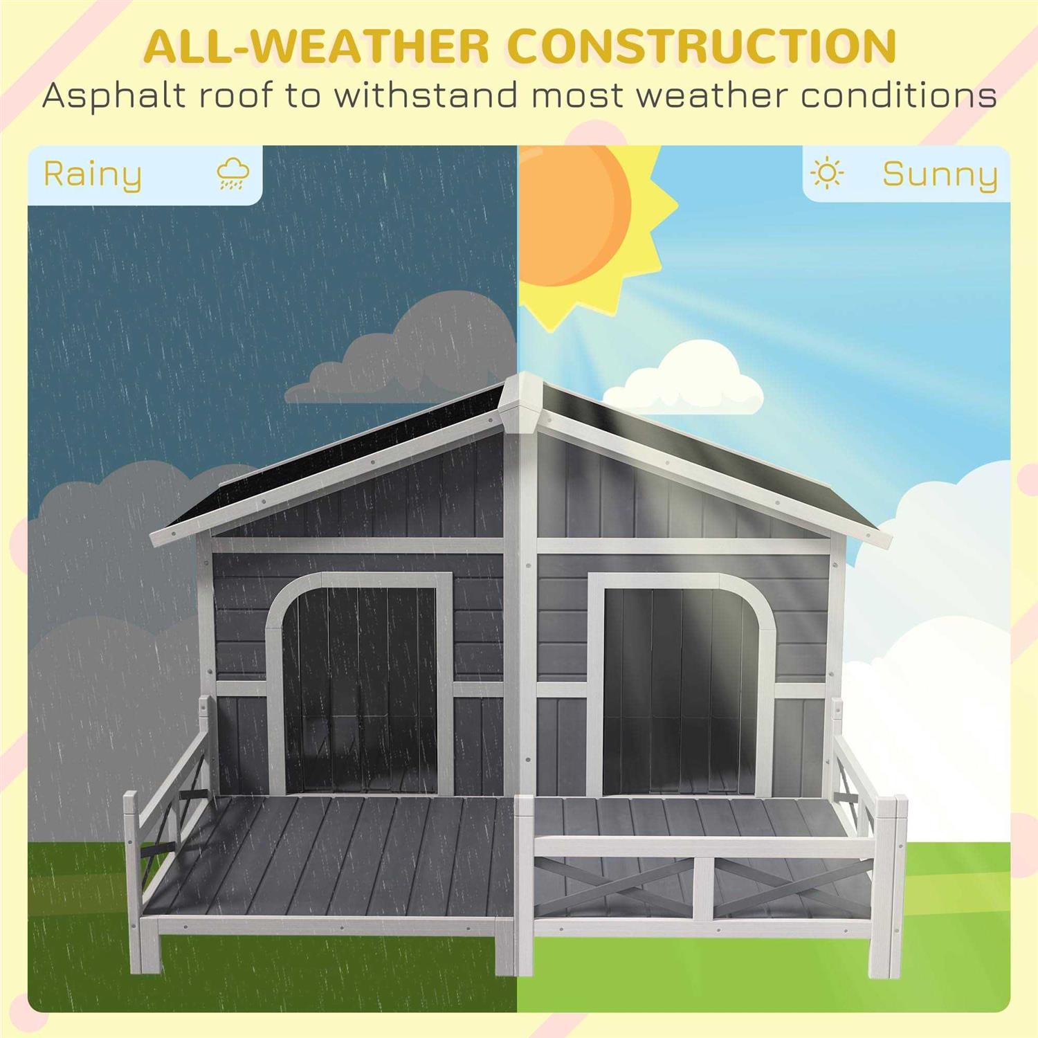Your lovely dog is sure to enjoy this amazing dog house with front deck porch from PawHut. This cabin style house has large living rooms with 2 individual parts, your pet will have roomy space to rest while also stay away from inclement weather. Inside with a side window for excellent air circulation and front doors with vinyl curtains keeps your dog protected from the wind, rain and snow. A spacious front deck to lounge in the sun and take a nap. Stylish and functional, it will surely be a great addition to your backyard, patio or any outdoor/indoor space!