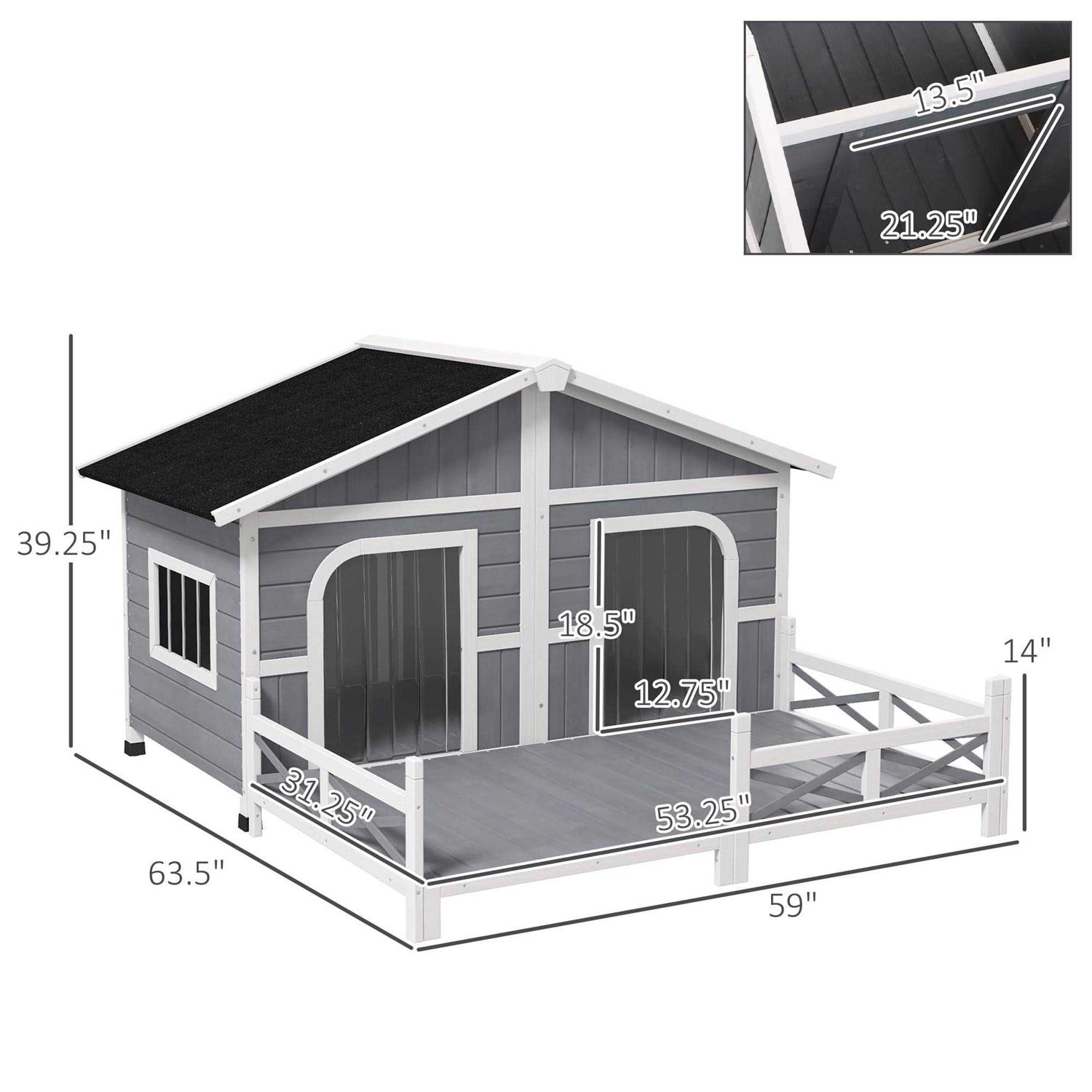 PawHut 59″x64″x39″ Wood Large Dog House Cabin Style Elevated Pet Shelter w/Porch Deck – Grey