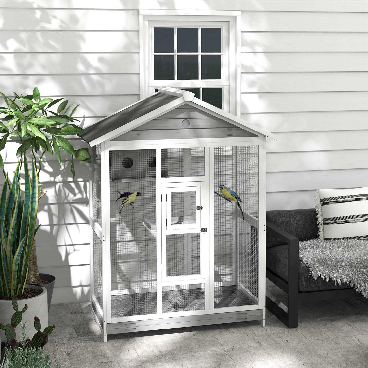 PawHut 64.5″ Wooden Bird Cage Aviary, Flight Cage with 4 Perches, Nest and Slide-Out Tray for Indoor/Outdoor, Gray