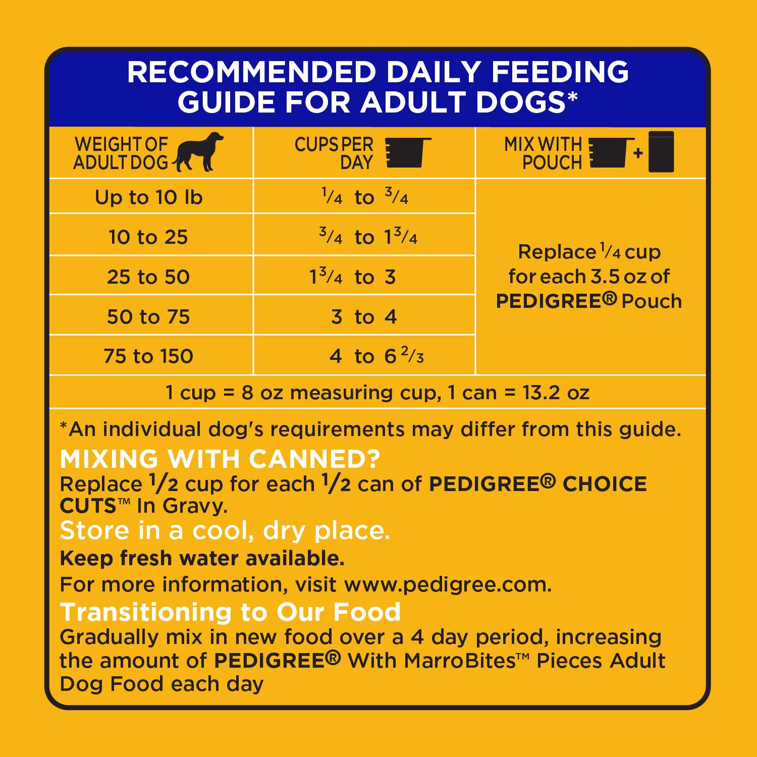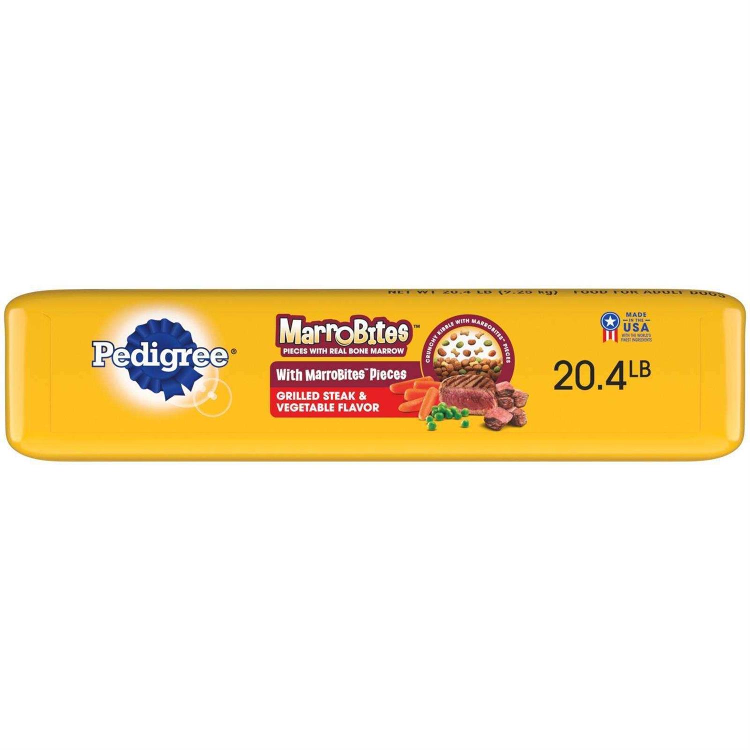 Pedigree with marro bites pieces adult dry dog food, steak and vegetable flavor is full of the delicious meat and marrow flavors your dog craves. Made with whole grains, protein and accents of vegetable, this nutritionally complete adult dry dog food is enriched with omega 6 fatty acids and zinc to help support the health of your dogs skin and coat. Our recipes are made with the finest ingredients from around the world and no high fructose corn syrup, artificial flavors, or added sugar so your dog gets all the nutrition they need and nothing that they dont.