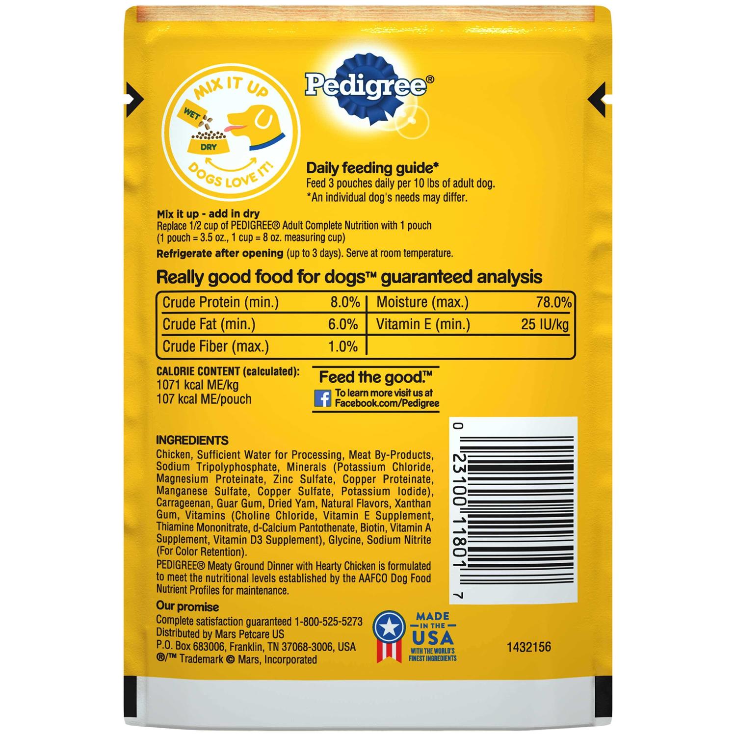 Pedigree Chopped Ground Dinner wet dog food with Hearty Chicken delivers the taste dogs crave with the nutrition they need. Your dog can enjoy the delicious taste of real chicken in every bite! Our formulas for adult dogs of all sizes provide the perfect balance of vitamins and minerals with no artificial flavor, no added sugar, and no high fructose corn syrup. Each recipe is 100% complete and balanced for canines, so you know they’re getting the most out of their diet. Serve as a topper, a mixer with dry dog food, or a complete meal. Feed your dog nutritious food for a healthy, happy life with Pedigree Pouches.