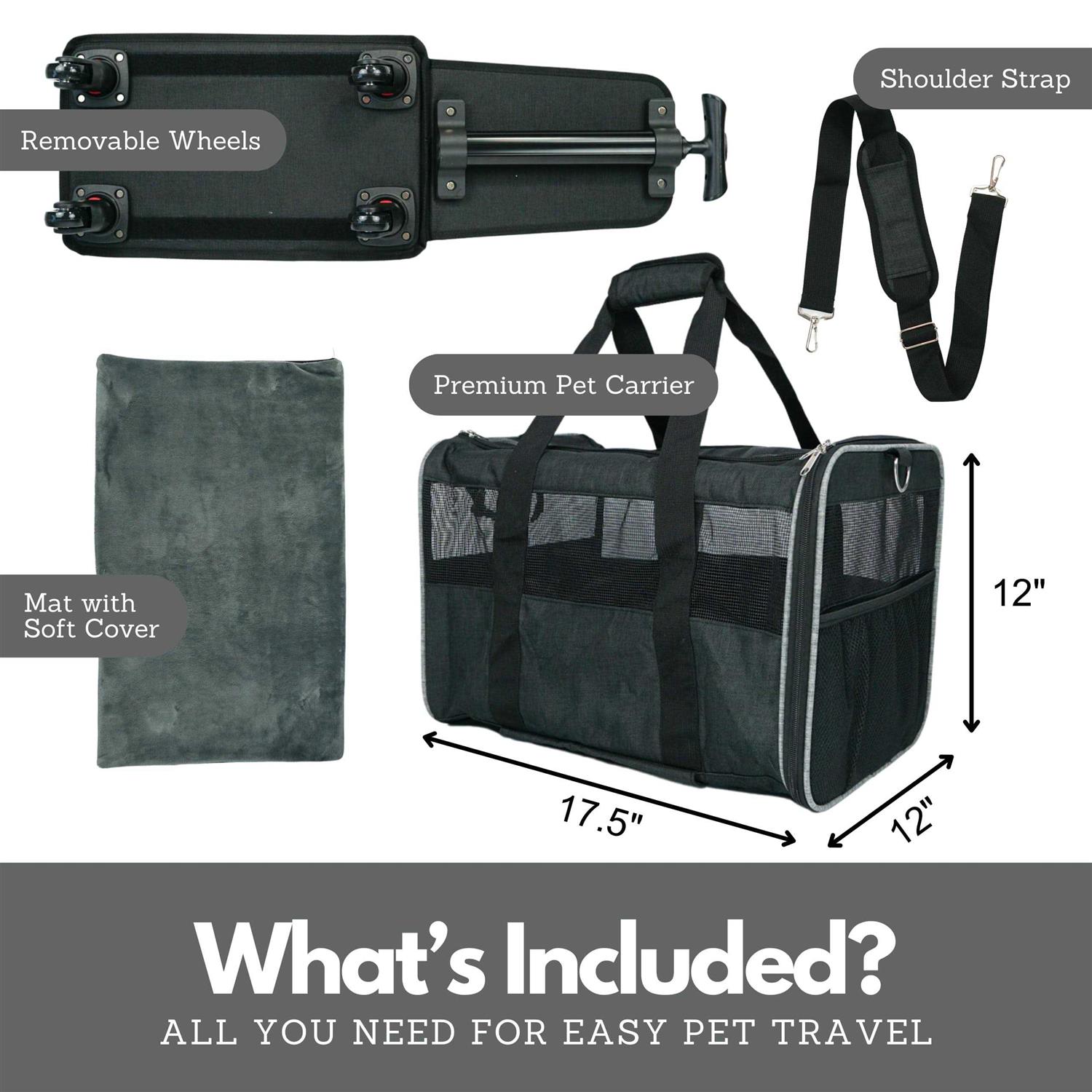 MULTIFUNCTIONAL 3-IN-1 DESIGN: Our Travel Pet Carrier is a game-changer in pet travel. It seamlessly transitions from a traditional carrier to a rolling one, giving you the flexibility to choose the most convenient mode of transportation for any situation. Carry using the short straps, shoulder strap or attachable wheels. AIRPLANE APPROVED PET CARRIER: Our pet carrier measures 17.5” x 12” x 12” and meets the strict regulations and guidelines set by airlines, ensuring that your pet can accompany you in the cabin comfortably and safely. Say goodbye to the anxiety of checking your pet in as cargo; with our carrier, your pet stays close throughout the flight. DESIGNED FOR DOGS & CATS: Whether it’s a weekend getaway or a long-haul international trip, our Airline Approved Pet Carrier is the perfect companion. It’s suitable for cats, dogs, and small animals, so you can embark on adventures together. DETACHABLE 360 ROTATING WHEELS: Say goodbye to shoulder strain and sore arms! Our pet carrier comes equipped with durable, smooth-rolling wheels and an adjustable telescopic handle, making it effortless to transport your pet through airports, train stations, and crowded streets. Traveling has never been this stress-free. HEAVY DUTY MATERIALS: Crafted from high-quality, breathable materials, our pet carrier ensures your pet’s safety and comfort at all times. The mesh panels provide excellent ventilation, while the sturdy construction guarantees durability for years to come.