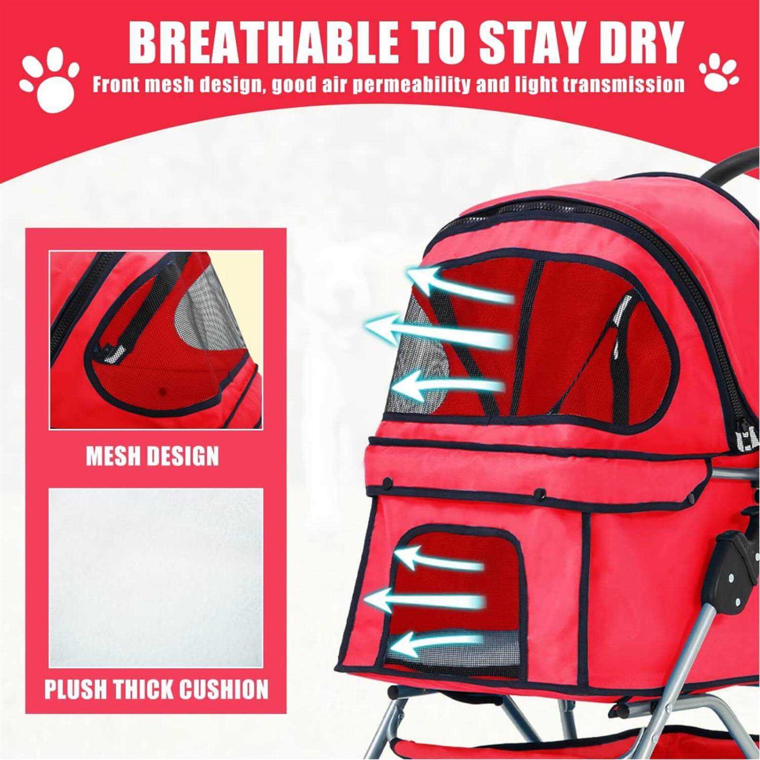 The pet stroller is a great way to take your pet with you on a long walk around the block or through the park. The 4-wheel dog stroller is easy to maneuver and includes rear wheel brakes to prevent it from rolling accidentally. The dog stroller has a locking mechanism to keep it parked safely wherever you want. This pet stroller has a large storage basket and cup holders to give you ample space for just about anything you need for a stroll with your pet. It features a durable mesh for airflow, visibility, and keeping insects out. This pet stroller folds down easily for storage or travel. This red pet stroller can hold up to 25 lbs and it is easy to assemble with detailed product instruction.