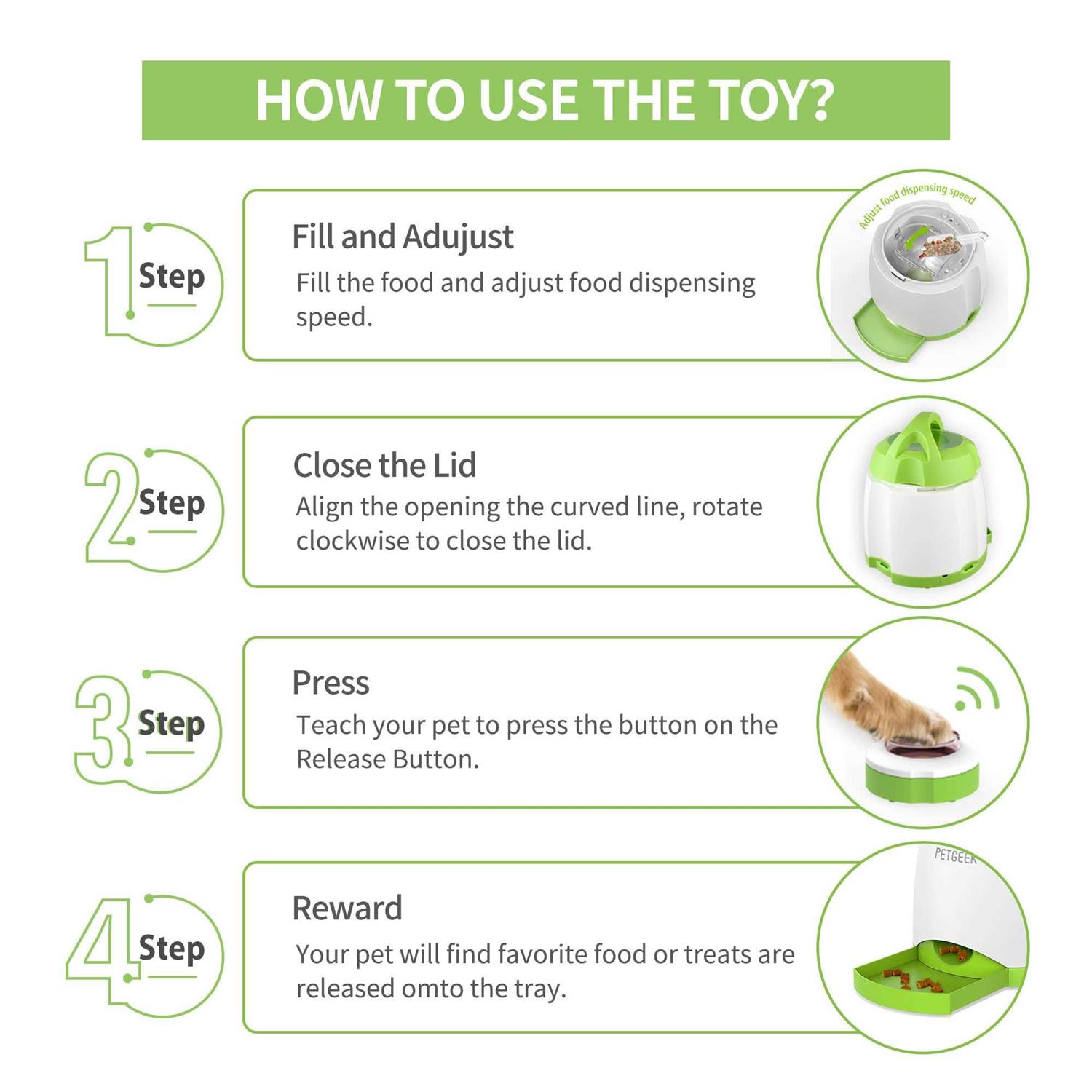 Open the adjustable treat dispensing window, pour in your pet’s favorite treats or dry food, when dog press on the release button, he will find treats or food are auto released onto the tray. DOG TREAT TOY: The puzzle games for dogs is begain. Teach your dogs to press the button of the dog enrichment toys to get their favorite dog treats to fall out as a reward! When dogs play with the food-dispensing interactive dog toy, the feeder will keeps dogs physically active and improves memory! PET FEEDER with EXCITING SOUND: The treat dispensing dog toys will make exciting sound when your pet presses on the release button, repeat this several times to get your pet used to the sounds the food dispenser makes, mentally stmulate your dog and encouraging more extended playtime. DUAL POWER SUPPLY TREAT DISPENSER: The automatic dog feeder support 2 power supply Modes. Install 3xAAA batteries (not included) in the battery box under the remote control buttons and 4xC batteries (not included) in the battery compartment, or charge via the included micro USB cable. DOG ACTIVITY TOY: The rubber holder and sucker are for dog indoor play and the peg is for dog outdoor play use. The remote controller up to 164ft distance in indoor environment, and up to 98ft distance in the open air. You can train pets of all breed and size in various settings by our IQ training treat dispenser!