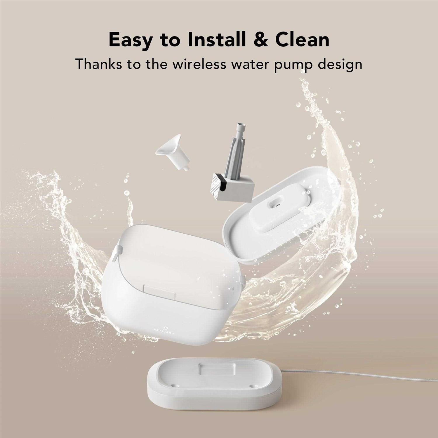 Unprecedented Cat Fountain With Wireless Pump – Time to get rid of those tangled wires. The PETLIBRO cat water fountain with wireless pump makes it super easy to clean every corner without hassle. Also, thanks to the industry-leading design, Dockstream extends the life of the water pump, and with no wires immersed in water, you never have to worry about electric shock. *NOTE: The water fountain is wall-powered. Only the water pump is wireless. Assemble in Few Steps – All parts are easy to assemble. The water tank can be detached from the base, and with the wireless water pump, it takes only a few minutes to assemble and dismount for daily cleaning and maintece. Vertical Filtration System – Every drop of water is filtered through multi-layer filtration to remove all impurities and provide oxygen-enriched and better-tasting water. 1. Activated carbon eliminates foul odors 2. Ion exchange resin removes heavy metal ions and softens water quality 3. The non-woven fabric captures cats’ hair and impurities 4. The built-in pump sponge further filters debris to prevent blockages and damage. Attractive As Ever – PETLIBRO pet water fountain provides a free-falling stream or bubble fountain to satisfy different pets’ preferences and entice picky buddies to drink more water, which keeps them well-hydrated and prevents kidney disease. 23dB Supremely Silent & Auto Off Sensor – Sleep soundly even when the Dockstream cat drinking fountain is in your bedroom. The advanced water flow structure filters out noise so the entire fountain clocks in at a barely audible 23dB—quieter than a whisper. Also, the pump automatically stops when water levels dip below a safe level, preventing the pump from overheating..