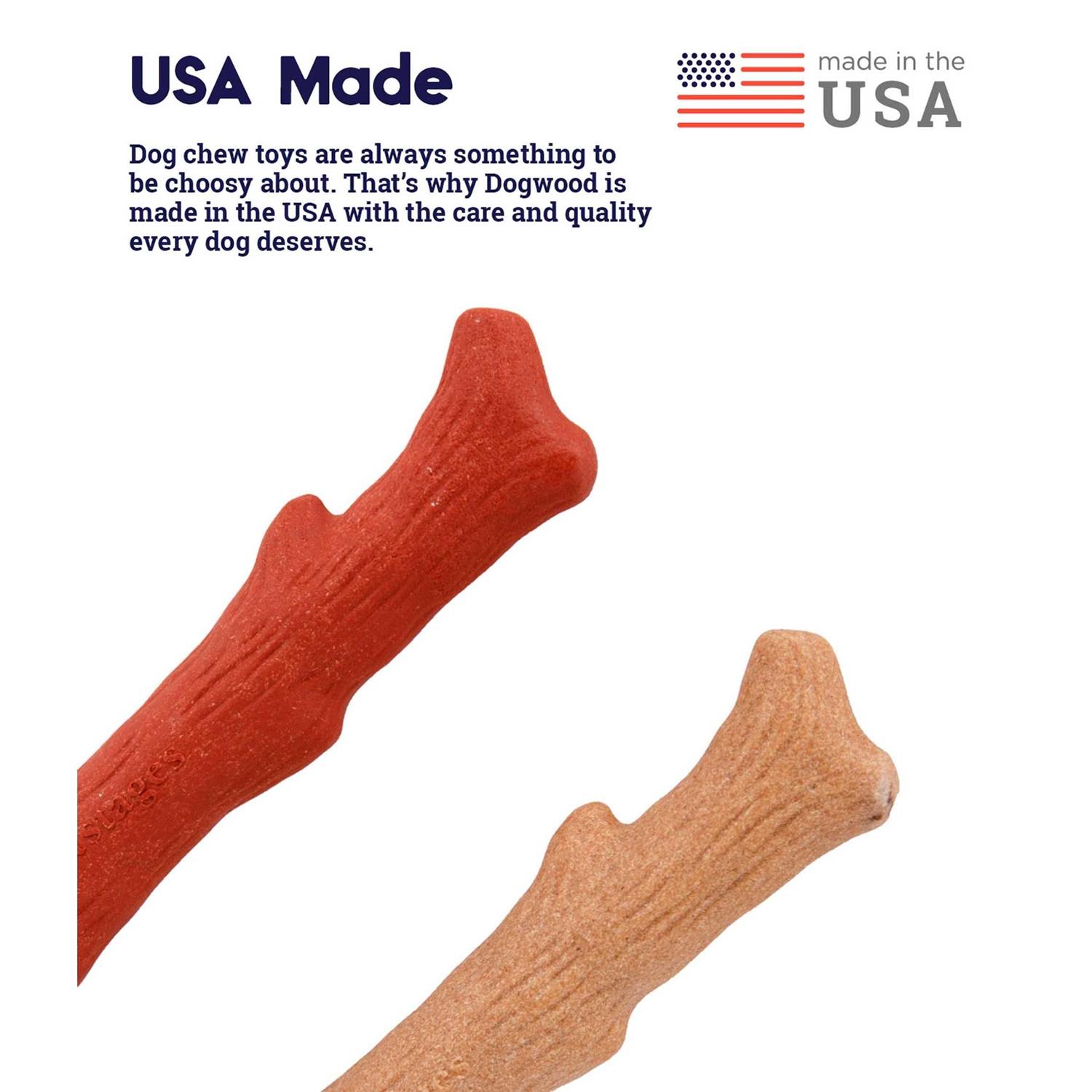 The best of both flavors! Help fulfill your dog’s natural chewing instincts with Petstages Dogwood Dog Toy 2pk! This dog toy is crafted in the USA with real wood and a synthetic material for added durability. Think of it as an upgraded version of a regular stick—that means no unsafe splintering and no dirty mess! And as your pal chews to his heart’s content, you won’t have to worry about the toy staining your white carpets and clean floors since the natural wood and mesquite flavors stay on the sticks.
