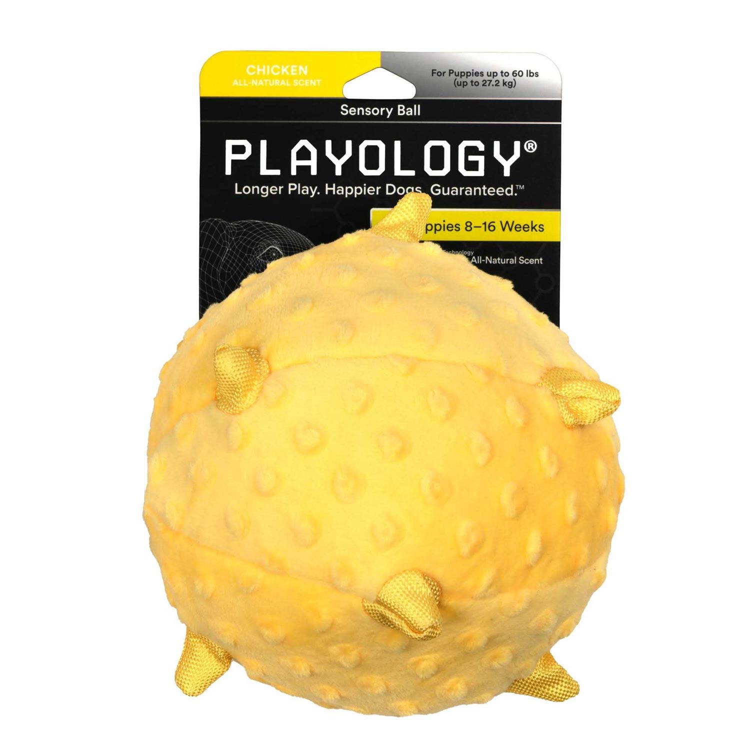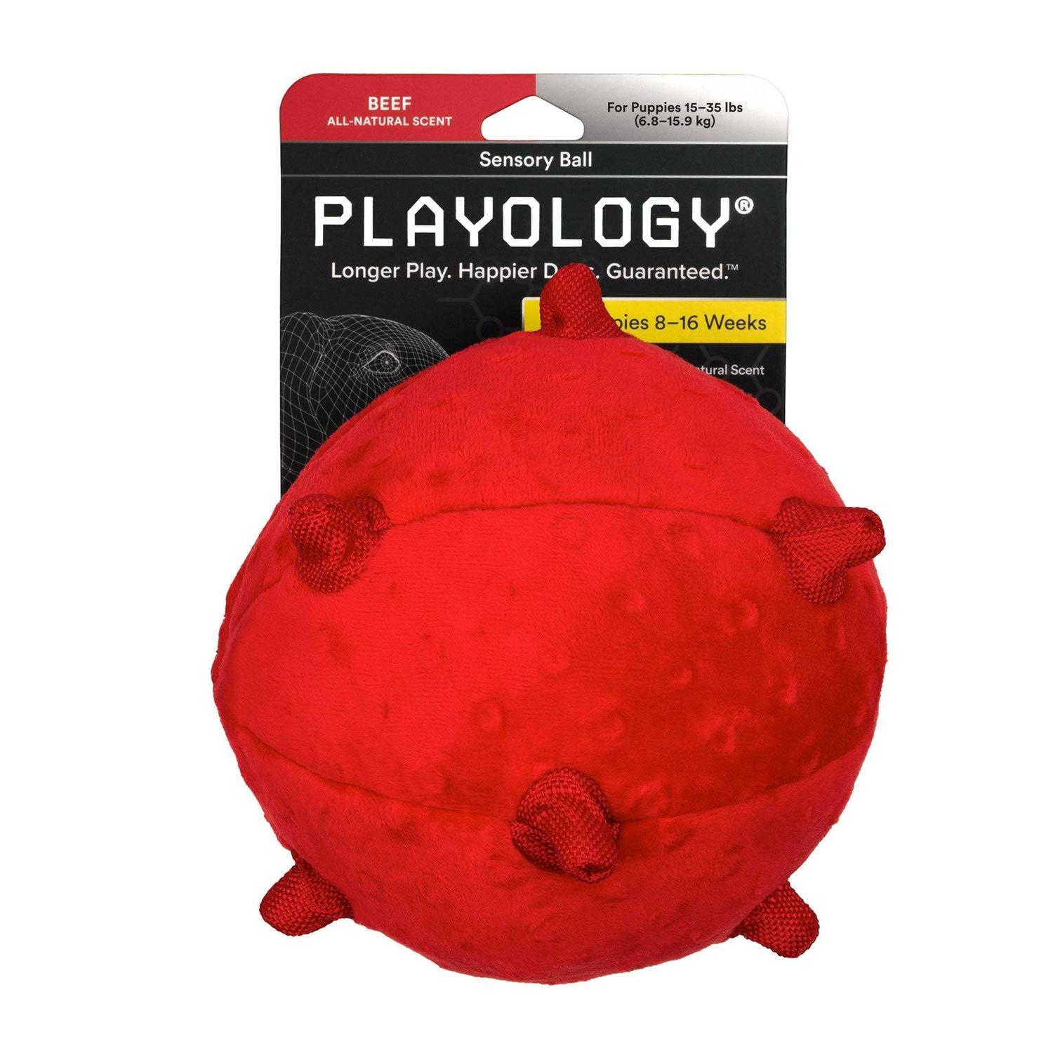 Squeak Toys by Playology. Details:Large Beef-Scented Sensory Ball: Thoughtfully designed with engaging suckling spikes, a fun squeaker, and an all-natural Beef scent, the Playology Puppy Sensory Ball is designed to aid in puppies’ early development. The Large size is perfect for puppies up to 60 lbs.