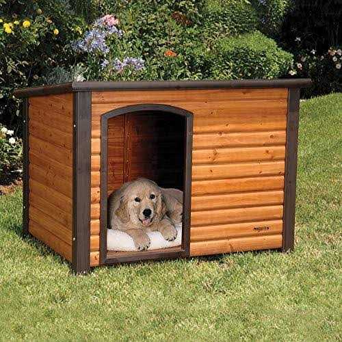 Improve the appearance of your backyard and provide your dog with a sturdy, weather-resistant shelter with the Extreme Outback Log Cabin Dog House. Constructed of solid fir wood with a cedar-colored stain, this dog house has a slanted asphalt shingle roof that drains water off the back edge. And waterproof plastic feet raise the log cabin off the ground to ensure the floor, and your dog, stays dry. The entrance is off-center, giving your dog superior shelter from the wind and the elements and allowing him to turn around easily. You can assemble the house in three simple steps with a screwdriver. Available: Medium: 45-1/2″ L x 26-1/2″ W x 27-1/2″ H.
