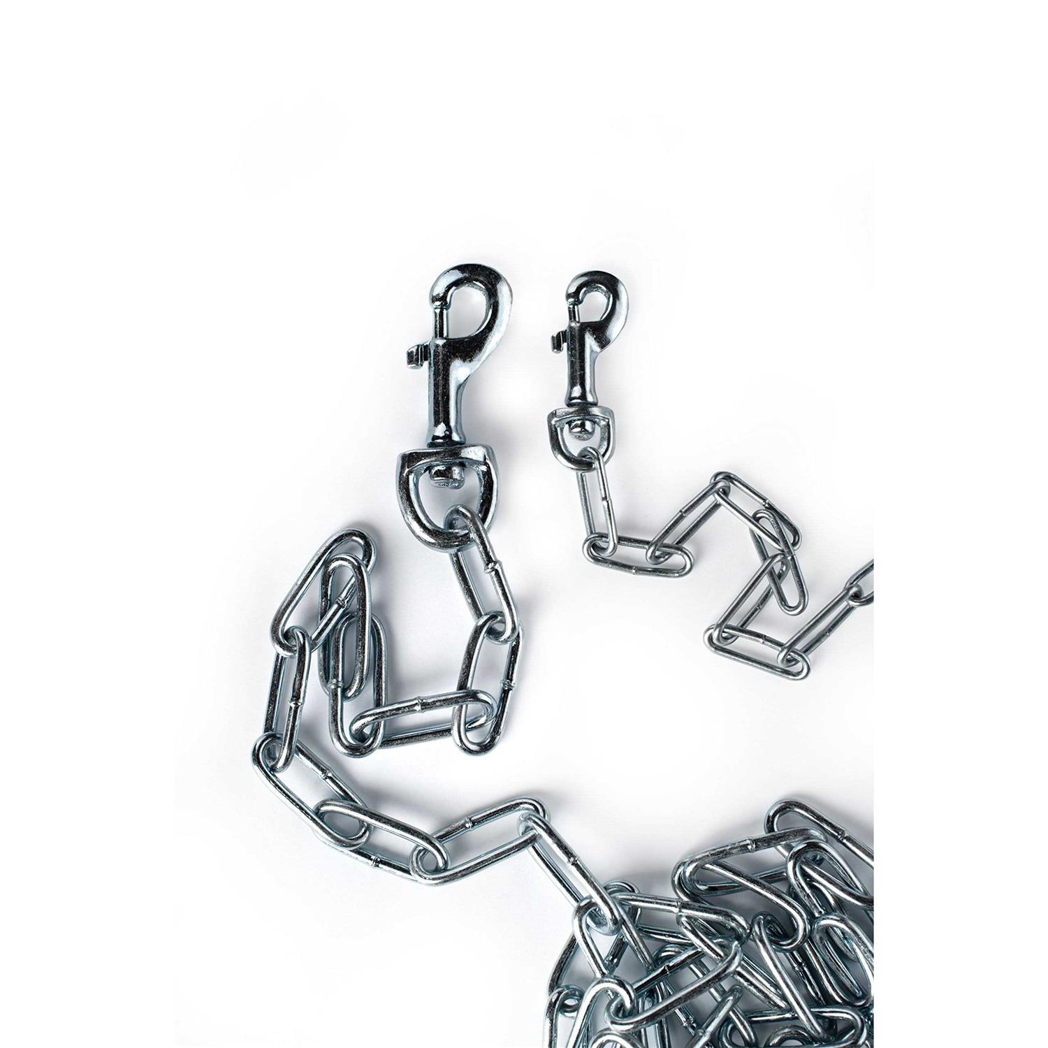 Medium duty for dogs up to 55 lbs Zinc plated welded oval links Die-cast iron Swivel bolt Snap ends 2.5 mm Diameter chain 15 feet long Prevue Pet Products medium-duty 15Æ tie-out chain 2114 is designed for dogs up to 55 lbs. Zinc plated welded oval links are strong,ensuring your dog stays safe and secure. Premium quality die-cast iron swivel bolt snaps at both ends connect easily and prevent tangling. Medium duty tie out chain is 15 foot long and 2.5 mm in diameter.