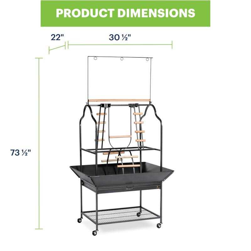Prevue Pet Products Parrot Playstand includes hooks for hanging multiple toys and treats, along with different sized stairs and ladders for plenty of space to climb. Double cups provide room for food, water or treats, and the easy-rolling caster stand lets you easily move the playstand from room to room or indoors to outdoors. A pull-out drawer, along with the rounded corner seed guard, make cleaning quick and easy, while the bottom storage shelf is perfect for keeping extra food, treats, toys and cleaning supplies. Our Parrot Playstand is available in a non-toxic, powder-coated, black hammertone finish and measures 30-inch long, 22-inch wide and 73-1/2-inch high to the top of the toy hook.