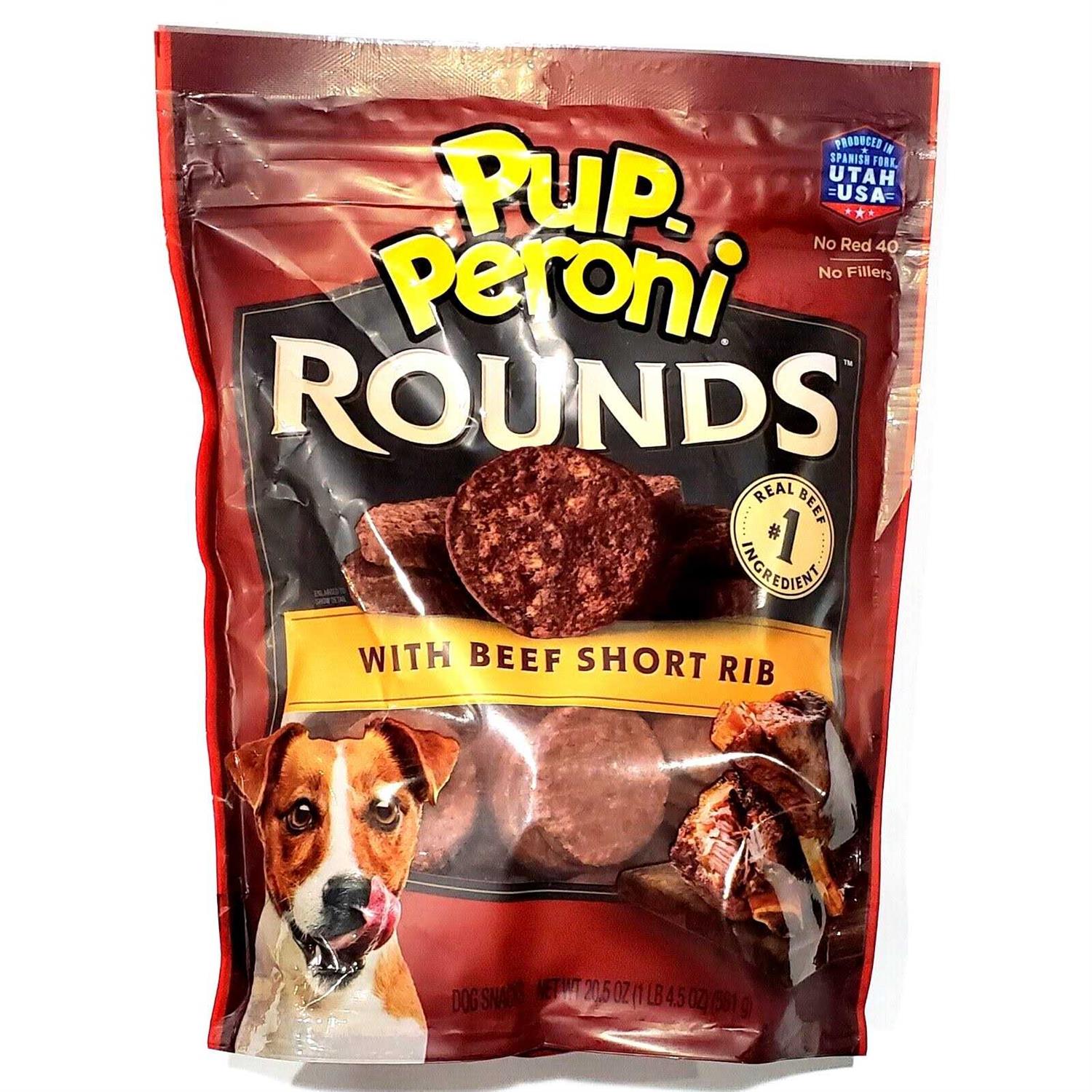Pup-Peroni Rounds Beef Short Rib Dog Treats, 20.5-oz pouch; Your pup will be running in circles begging for this fun, round treat! Pup-Peroni Rounds Dog Treats with Beef Short Rib are soft and chewy treats that feature real beef as the number one ingredient. The irresistible aroma and whisker-licking taste makes them the paw-fect reward for good behavior. Plus, these all a-round great snacks are free of artificial flavors, fillers, red 40 and added grains. Produced in Utah, USA. Beef short rib dog treats are paw-fect as a reward for good behavior or as an anytime snack for your BFF! Real beef is the #1 ingredient. Features an irresistible aroma and a fun, round shape! No artificial flavors, fillers, added grains, or red 40.