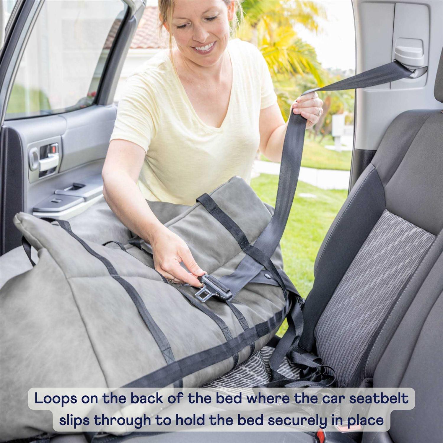 Give your pup a place to feel secure and comfortable in your vehicle with the PupProtector Faux Leather Dog Car Bed – the first dog booster seat with human-grade memory foam. Made of chic vegan leather for a modern look, this travel dog bed includes an easy to clean removable cover, pressure-relieving memory foam base, waterproof memory foam liner, and adjustable straps to help it stay put while the car is in motion. With an innovative design, this bolster dog bed contains extra spine and neck support to keep your pooch comfy and safe on car rides.