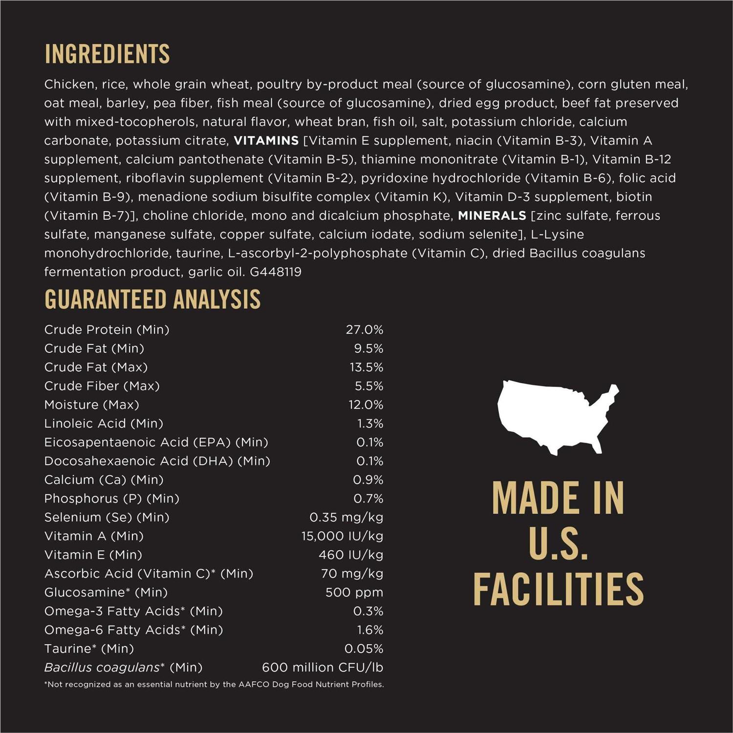 Helps reduce accumulation of body fat in large breed dogs. High levels of fiber to help dogs feel satisfied while losing weight. Contains natural sources of glucosamine for joint health and mobility. Contains taurine to help support a healthy heart. Complete nutrition with vital antioxidants helps support a healthy immune system. Helps reduce accumulation of plaque and tartar for dental health. Vitamin A and linoleic acid, an omega-6 fatty acid, promote healthy skin and a lustrous coat.