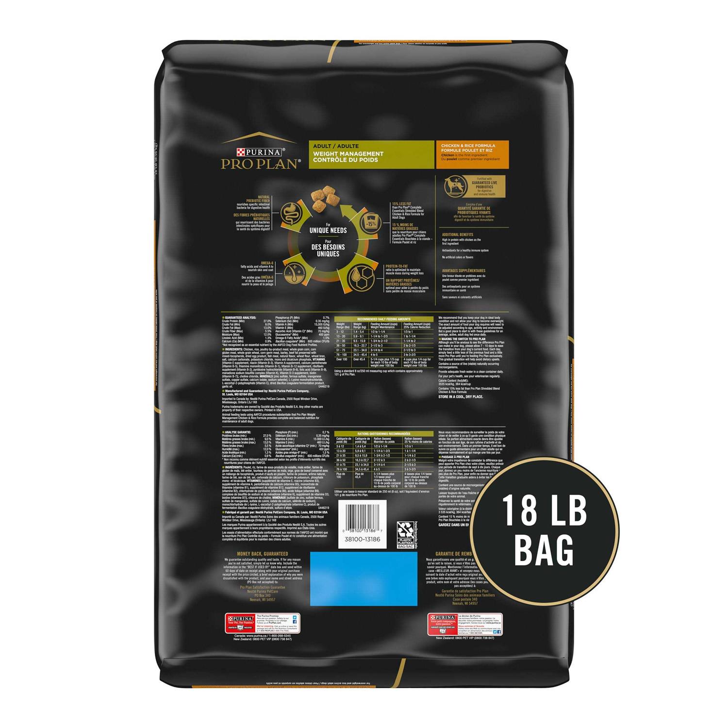 When a dog maintains a healthy weight he is able to live life to the fullest with abundant energy, mobility and stamina. This cutting-edge formula lays the nutritional groundwork for longevity, robust good health and an overall ability to thrive. Healthy Weight Maintenance With 25percent less fat than Pro Plan Chicken and Rice Formula for adult dogs. Muscle Mass Maintenance High levels of protein help protect muscle mass during weight loss. Healthy Heart High-quality protein along with essential vitamins and minerals. Strong Immune System Complete nutrition with high levels of antioxidants, natural milk proteins and additional quality protein including real chicken. Healthy Digestive System With natural prebiotic fiber from whole wheat bran.