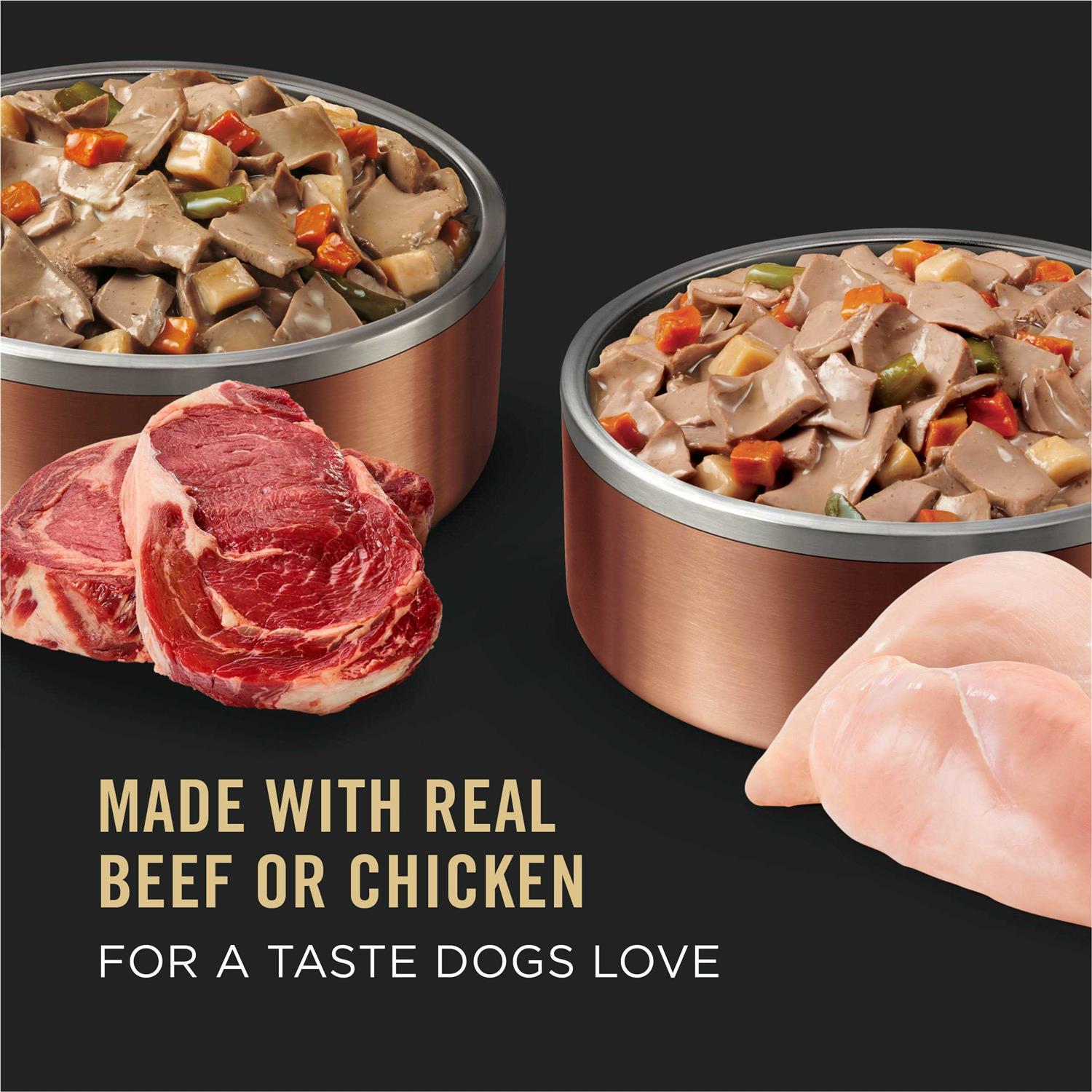 Keep mealtime interesting with the two flavors in this Purina Pro Plan Complete Essentials Grain Free adult wet dog food variety pack. Featuring real chicken or beef as the first ingredient, both dog wet food formulas deliver high protein to support an ideal body condition. Moist, tender pieces packed with tempting flavor encourage him to dig in. He gets 23 essential vitamins and minerals for overall health and wellness support, along with the taste and texture he loves. This premium dog food variety pack leaves out artificial colors, flavors or preservatives, so your adult dog gets 100 percent complete and balanced nutrition free of unwanted ingredients. This pate dog food loaf helps support a healthy immune system and his healthy skin and coat. Switch up meals with two Purina Pro Plan Complete Essentials grain free wet dog food entrees while providing the Purina dog food nutrition he needs.