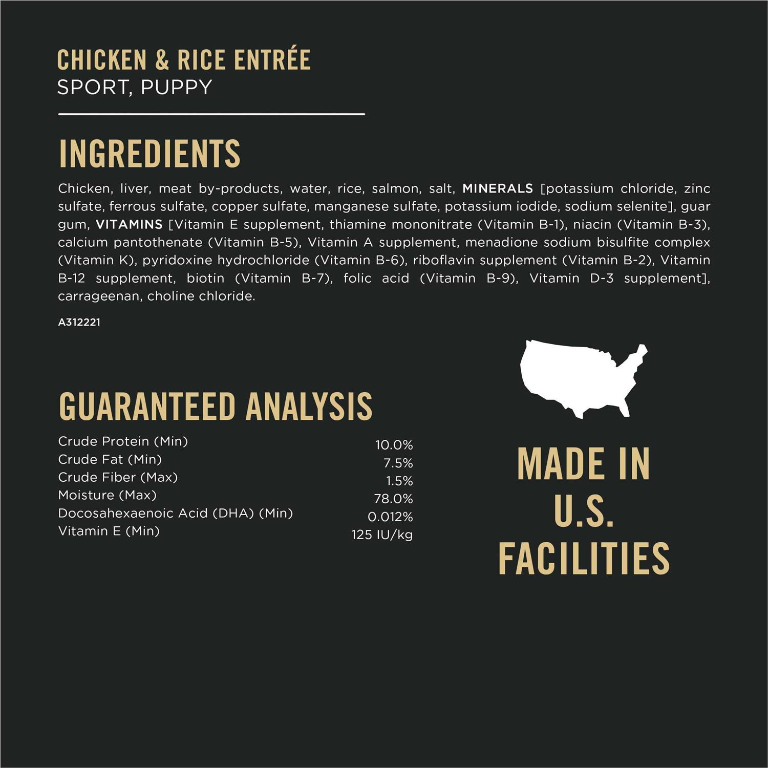Included in this wet dog food variety pack are the vital nutrients they need, like 23 essential vitamins and minerals to fuel your puppy’s active lifestyle. Not only that, but this high protein wet dog food supports lean muscle development in growing puppies. Plus, this Purina Pro Plan puppy food variety pack includes antioxidants for dogs to support immune system function, while DHA supports brain and vision development. Specifically formulated with 100% complete and balanced nutrition for puppies and real chicken or beef as its #1 ingredient, each formula in this Purina Pro Plan Sport canned dog food variety pack is proudly manufactured in Purina-owned U.S. facilities.