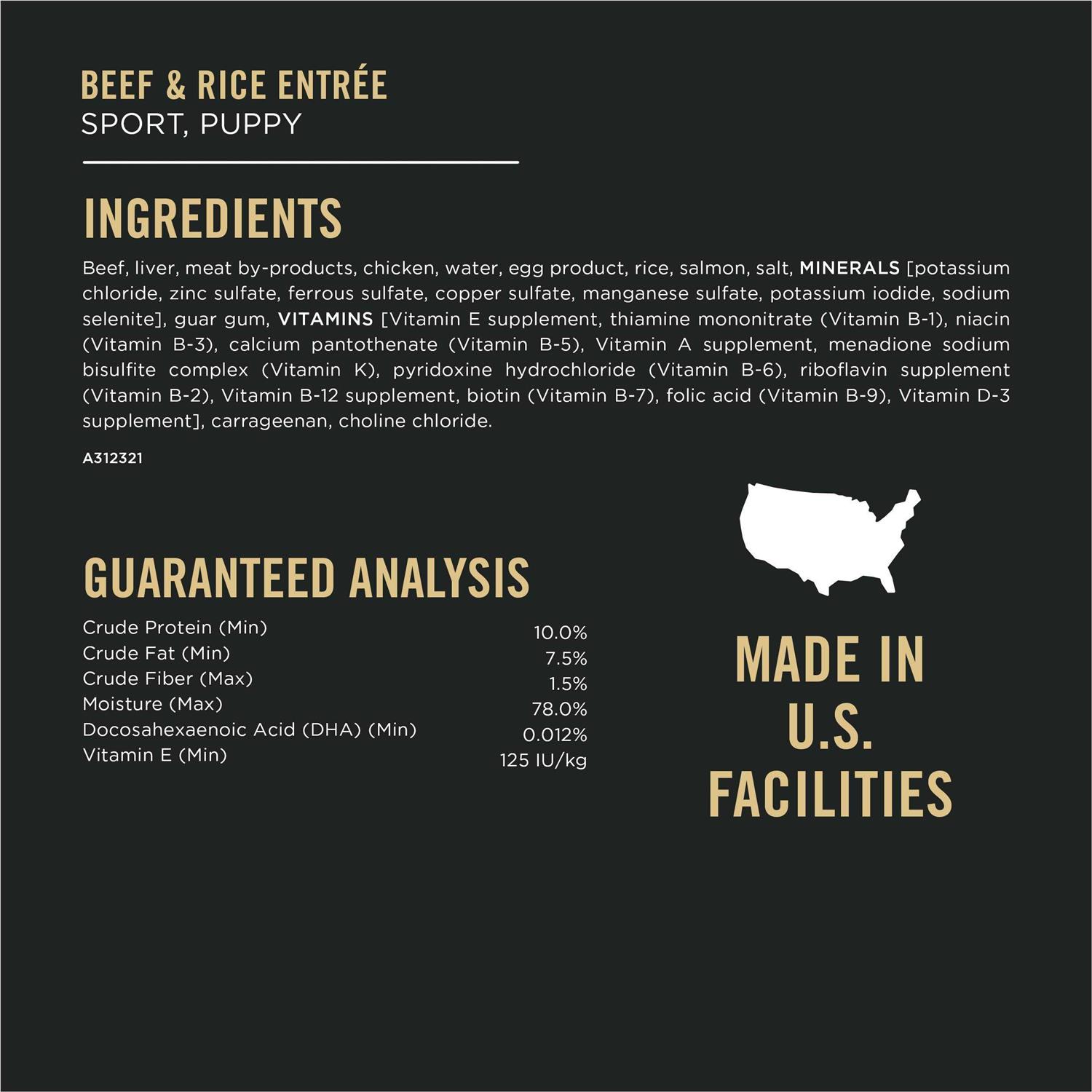 Provide your rambunctious and playful puppy with the active dog food they need to develop into an adventurous adult dog with Purina Pro Plan Sport High Protein Wet Dog Food for puppies Beef & Rice formula. With real beef as the #1 ingredient, this high-quality wet puppy food is packed with the nutrition puppies need to flourish. With a blend of 23 vitamins and minerals and antioxidants for a healthy immune system, this Purina Pro Plan Sport dog food delivers 100% complete and balanced nutrition for growing puppies. Also included in this canned ground dog food formula is DHA, an Omega-3 fatty acid to help with brain and vision development. This beef dog food contains high quality protein to help build lean muscles for an active life. Purina Pro Plan dog and puppy foods are free of artificial colors, flavors or preservatives and are manufactured at Purina-owned U.S. facilities where they are rigorously tested for quality and safety. Try this Purina high protein dog food today risk free.