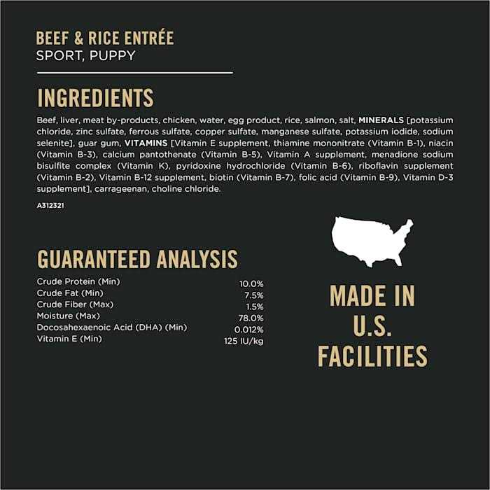 Prepare your growing puppy for a lifetime of activities and adventures by feeding them Purina Pro Plan High Protein Sport Canned Puppy Food Beef & Rice formula. Featuring real beef as the #1 ingredient and packed with protein, this puppy dog food is excellent for fueling the lifestyle of active and athletic puppies. The high protein content in each can of this puppy dog food is effective in supporting your puppys lean muscle development as they grow. Each serving of this Purina Pro Plan Puppy Food features a powerful blend of 23 essential vitamins and minerals to promote your puppys overall health and wellness. Also included are antioxidants for dogs to help puppies develop a robust immune system as they grow and to help fight off cell-damaging free radicals. DHA, an Omega-3 fatty acid is included to aid in vision and brain development. This 100% complete and balanced formula has no artificial colors, flavors or preservatives, so youll know your puppy is getting everything they need and nothing they dont. You can rest assured that youre giving your dog a high quality wet puppy food knowing all Purina Pro Plan dog and puppy foods are proudly manufactured at Purina-owned facilities where they are rigorously tested for quality and safety.