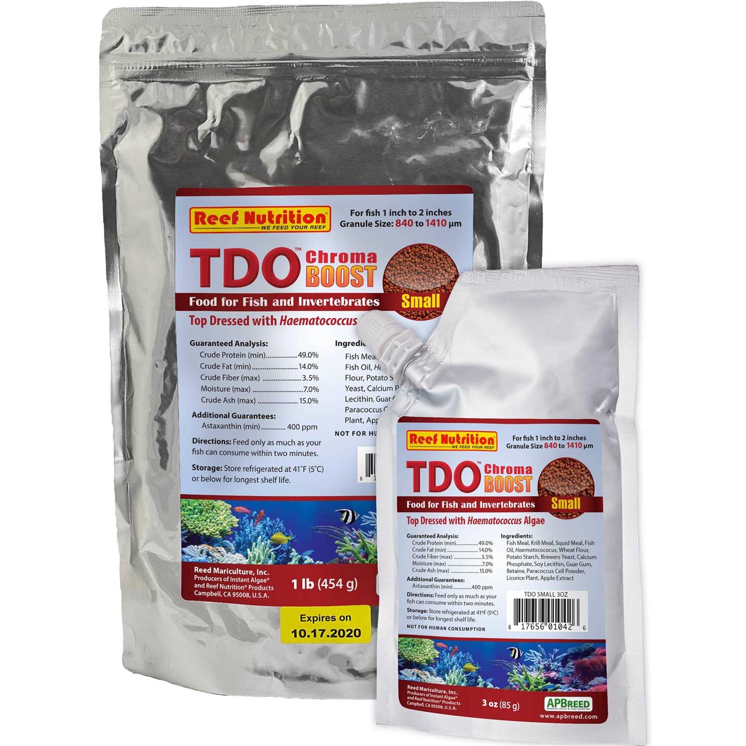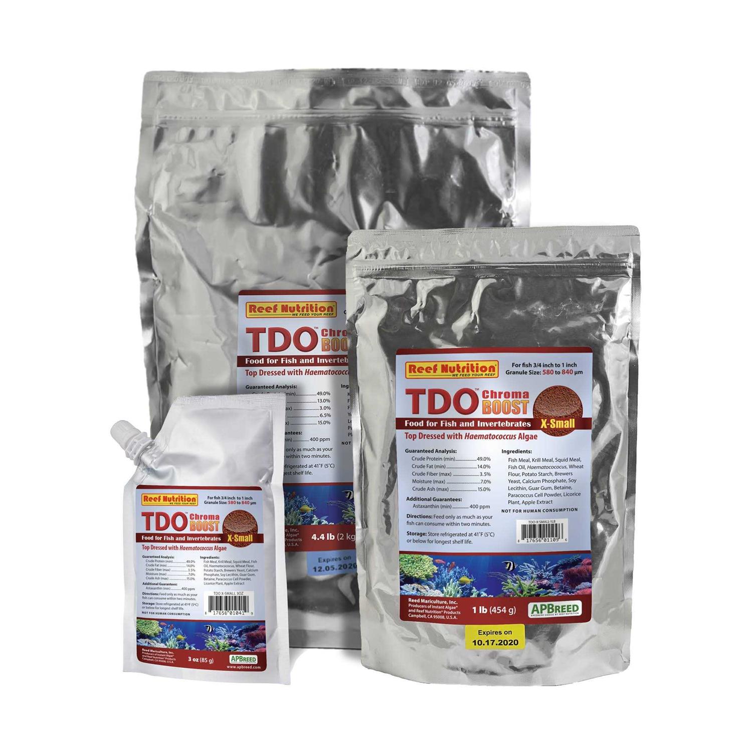 Description TDO Chroma BOOST is a granulated and pelleted fish and coral feed “top-dressed” with Haematococcus (which provides an excellent source of astaxanthin) for vibrant color and superior nutrition. New formulation optimized with 400 ppm astaxanthin for the reddest reds and whitest white. Feed small amounts frequently, but do not allow uneaten food to accumulate in the tank. Feed larger fish only as much as they can consume in two minutes.