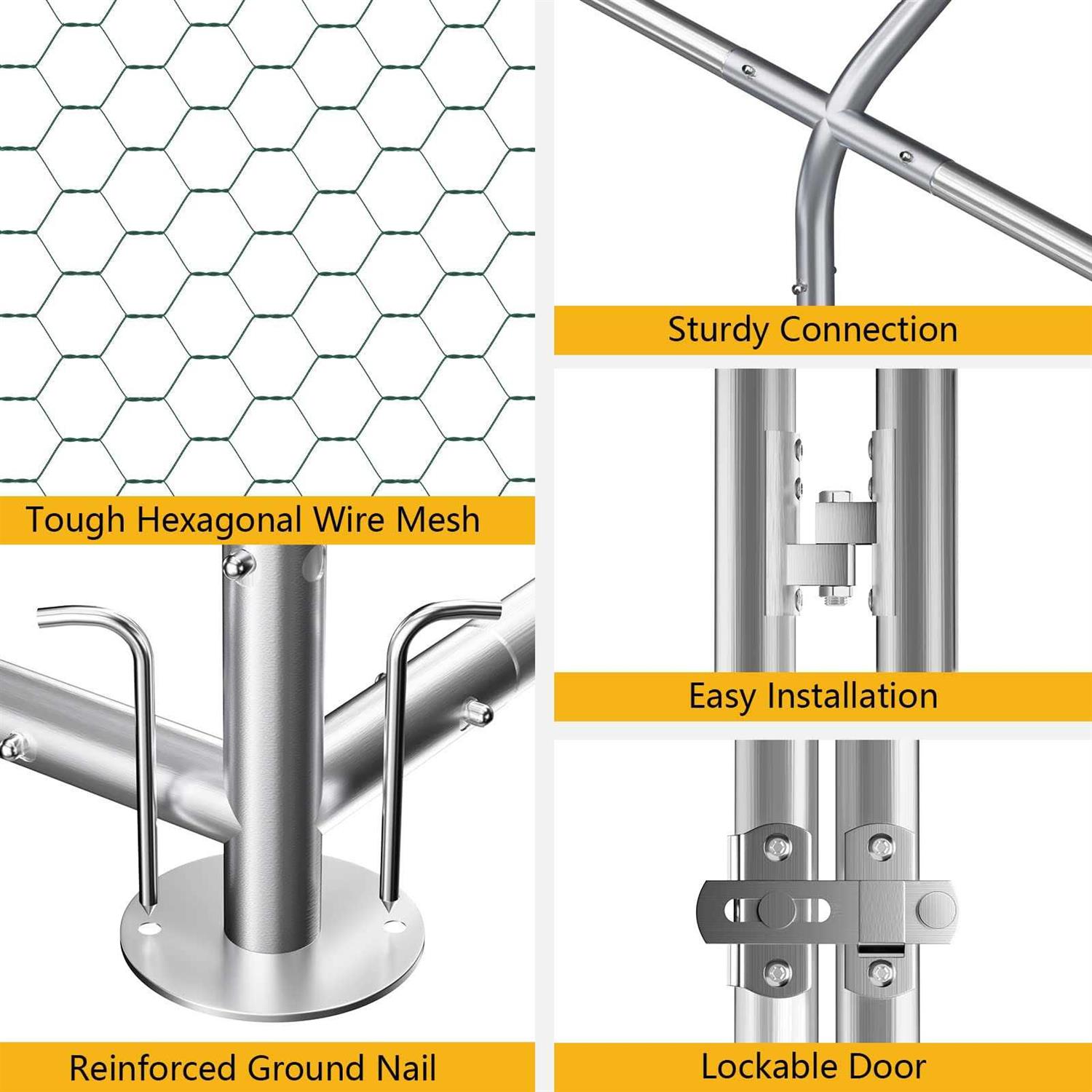 Anti- Rust And Durable Steel Structurethe Metal Chicken Coop Uses A High-quality Steel Pipe Frame, Coupled With Galvanizing Technology, Don’t Worry About Rusting In Outdoor. The Coop Is Solid Enough For Your Chicken To Have Free Space In It. Provide A Lot Of Zip Ties To Secure It From Predators.pvc Coated Hexagonal Wire Meshthe Wall Of The Chicken Run Is Made Of Pvc Coated Hexagonal Wire Mesh That Is Too Solid And Durable To Damage. Also, The Small Gaps Between Meshes Add Safety To Your Chicken That Prevent Them From Some Predators.removable Waterproof Coverthe Large Chicken Coop Outdoor Is Covered With A Sun-resistant And Waterproof Pe Material Roof That Ensures Full Protection From Sun,rain Or Snow.the Shed Frame Of The Spire Design Perfectly Drains Rain,snow Or Debris Which Makes Accumulation Impossible.lockable Doorthe Special Designed Metal Latch For Extra Reliability, And Easy For You To Feed Your Chicken And Clean The Inside.designed With A Number Of Essential Pedestals That Make It A Wonderful House For Any Poultry.easy To Install&multifunctionour Chicken Run Is Easy To Assemble ,the Outdoor Metal Chicken Coop With Instruction And Accessories.the Chicken Coop Can Be Used As A Habitat For Small Pets Such As Rabbits,ducks,cats,dogs,sheep,birds,and Land Turtles.it Can Also Be Set Up As A Planting Protection Shed For Flowers,vegetables And Fruits.