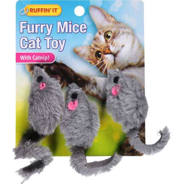 Fur mice 3/pkg contains three 3/4 x 4-1/2 x 1-1/4 in. Furry mice with catnip made of fabric. Designed to keep you feline friends active and happy. From classic best sellers to innovative new products, all ruffin it cat toys will provide a purrrfectly pounce-able experience for every cat.