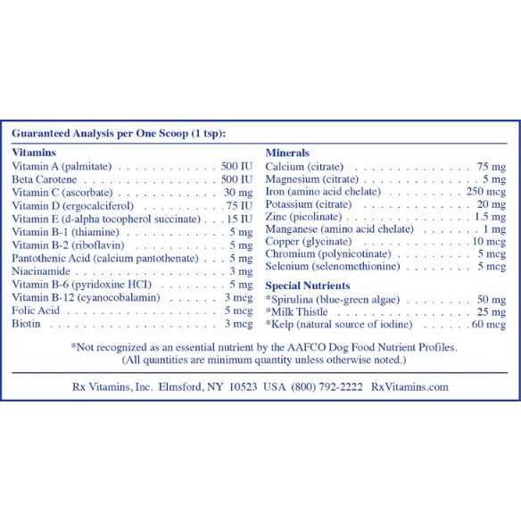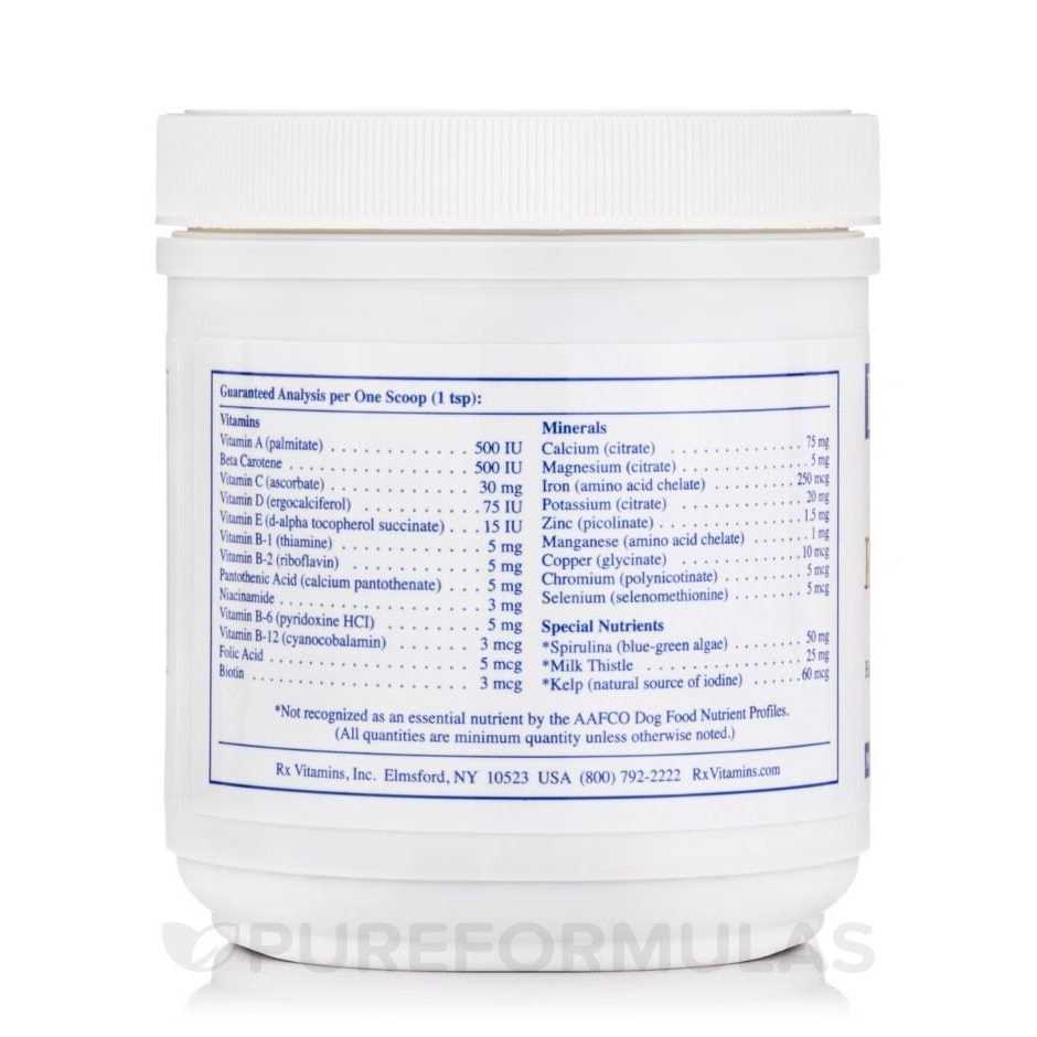 Rx Vitamins Rx Essentials Powder Multivitamin for Dogs, 8-oz bottle; Rx Vitamins Essentials Vitamin supplement offers a full range of what your dog needs to stay at the top of his health. With essential daily vitamins and organically chelated minerals, it also contains spirulina, kelp, and milk thistle for additional nutritional support. Easily administered with either wet or dry food, this powder supplement is an excellent supplement to home-cooked diets. Spirulina helps boost the immune system and digestive health. Added protein and iron from defatted‚ desiccated beef liver. Milk thistle supports liver health. Powder is easily added to wet or dry dog food. Comes as a high-quality powder that tastes good, too!