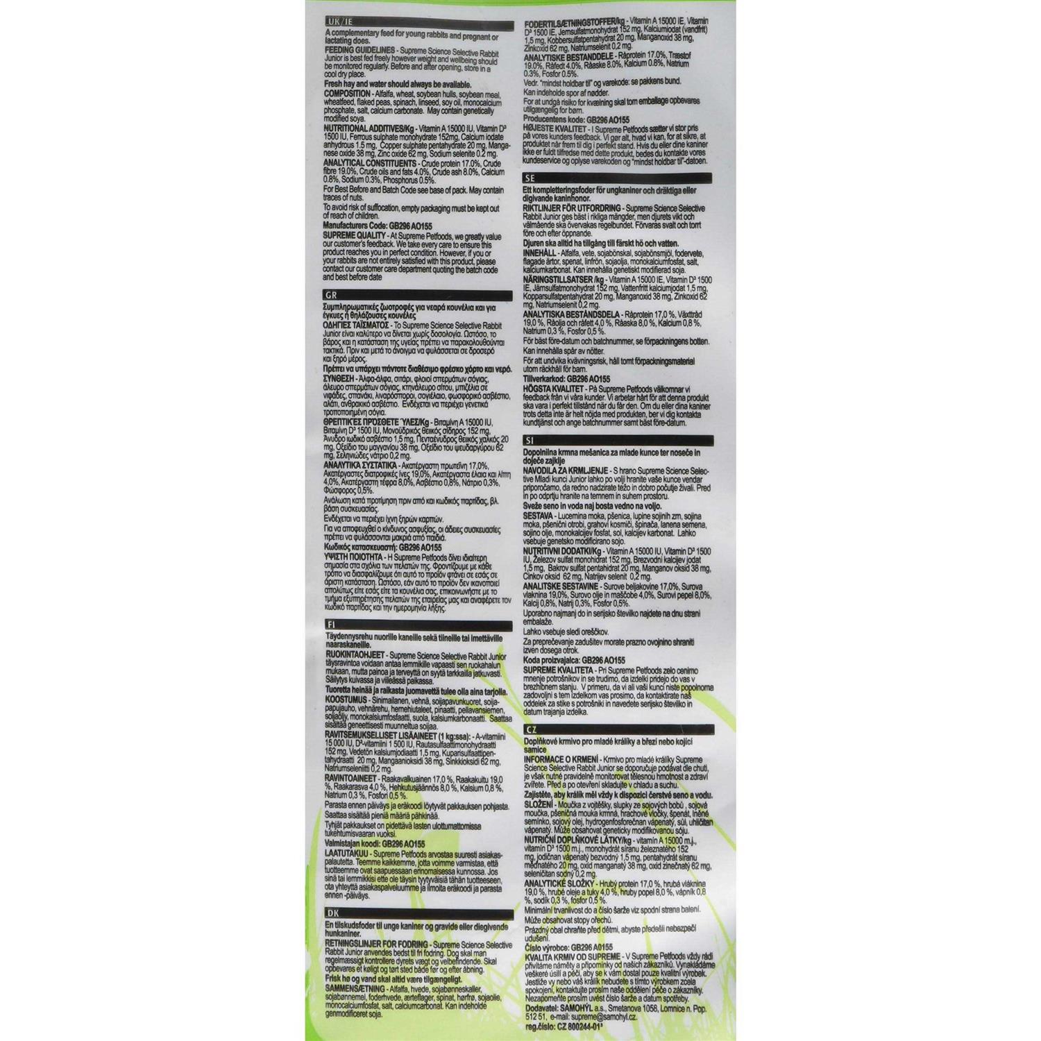 Supreme Science Selective Junior rabbit with high protein levels and antioxidants to assist growth and physical development. Feed from 4 to 20 weeks. Junior Selective Rabbit is an extruded biscuit which helps combat the problem of rabbits that selectively feed. It’s designed to encourage rabbits to chew in a way that will help avoid dental problems. Science Selective Rabbit is a nutritious and balanced complete food that is high in fibre and without sweeteners that cause obesity and rotting teeth. It incorporates a blend of premium quality raw materials extruded into a highly nutritional and palatable biscuit and contains a high level of fibre (19%) to promote gut motility, healthy digestion and even dental wear. Science Selective Rabbit contains Bio-Moss, a pre-biotic which boosts immune function, aids digestion and improves caecal consistency. The pre-biotic acts on harmful gut bacteria, allowing the beneficial bacteria to flourish.