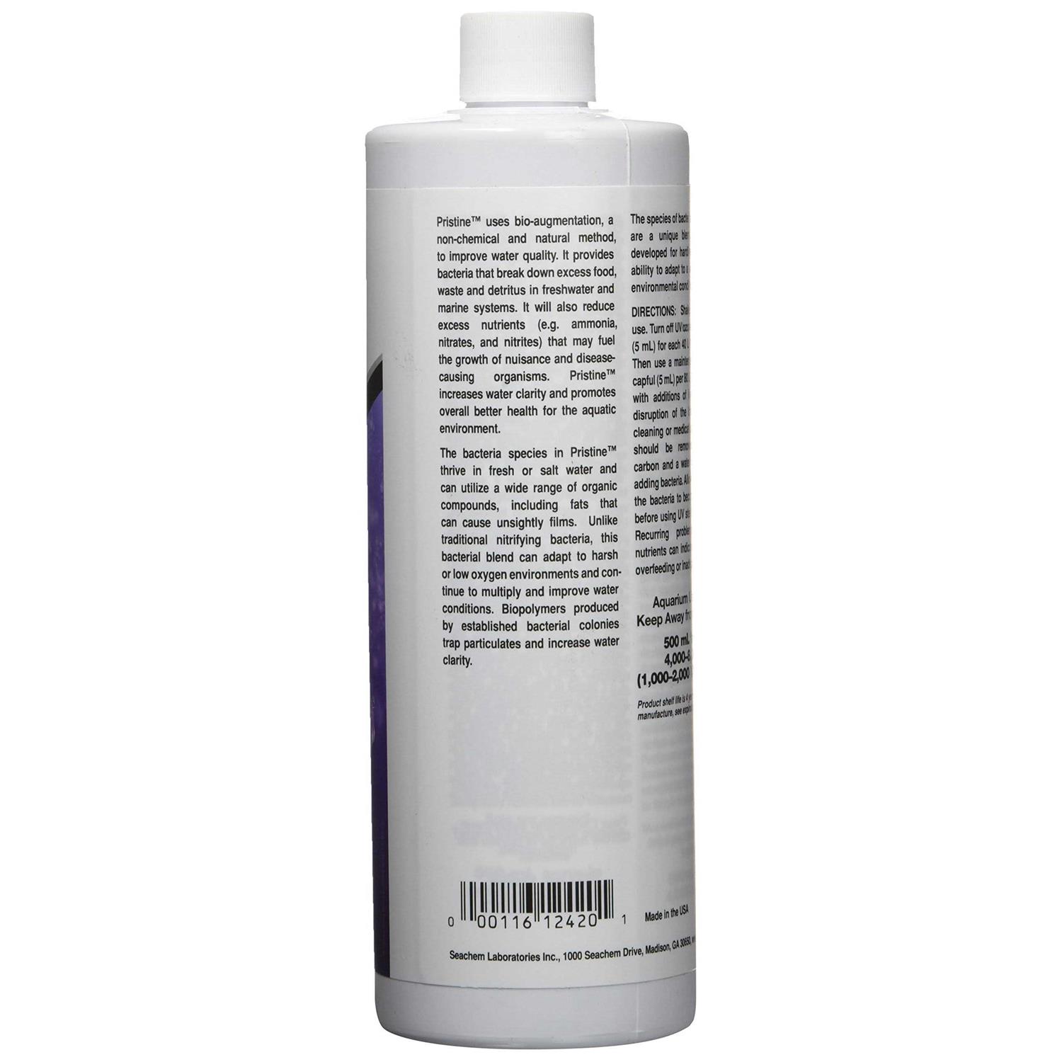 Seachem Pristine Natural organic waste management Rapidly and safely eliminates sludge and detritus Helps increase water clarity Marine and freshwater Pristine uses bio-augmentation, a non-chemical and natural method, to improve water quality. It provides bacteria that break down excess food, waste and detritus in freshwater and marine systems. It will also reduce excess nutrients (e.g. ammonia, nitrates, and nitrites) that may fuel the growth of nuisance and disease-causing organisms. Pristine increases water clarity and promotes overall better health for the aquatic environment. The bacteria species in Pristine thrive in fresh or salt water and can utilize a wide range of organic compounds, including fats that can cause unsightly films. Unlike traditional nitrifying bacteria, this bacterial blend can adapt to harsh or low oxygen environments and continue to multiply and improve water conditions. Biopolymers produced by established bacterial colonies trap particulates and increase water clarity. The species of bacteria in Pristine are a unique blend, specifically developed for hardiness and their ability to adapt to a wide variety of environmental conditions. Directions Shake well before use. Turn off UV/ozone. Use 1 capful (5 mL) for each 40 L (10 US gallons). Then use a maintenance dose of 1 capful (5 mL) per 80 L (20 US gallons) with additions of livestock or the disruption of the biofilter through cleaning or medications. Antibiotics should be removed with fresh carbon and a water change before adding bacteria. Allow 2 or 3 days for the bacteria to become established before using UV sterilizers or ozone. Recurring problems with high nutrients can indicate overstocking, overfeeding or inadequate filtration.
