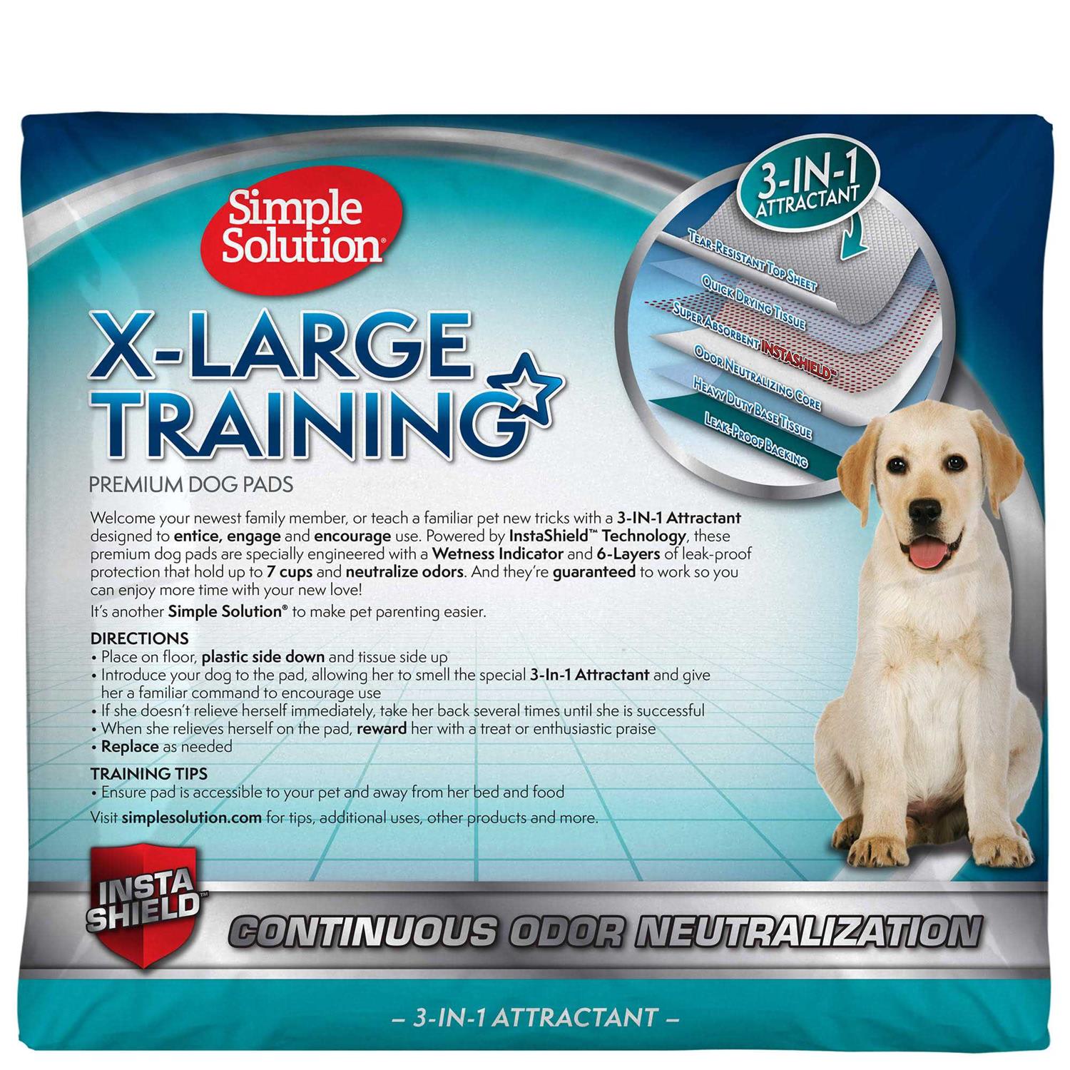 Simple Solution Training Pads, 50 Pads, Extra Large Features: 28 inches by 30 inches 100 percent more absorbent than original pads Features advanced polymer technology to convert liquid into gel Power odor control and attractant 50 pads per package. Description: Simple Solution Extra Large Training Pads are now 100% more absorbent, they hold 10 times more liquid than standard economy pads, and are 63% larger than traditional pads.