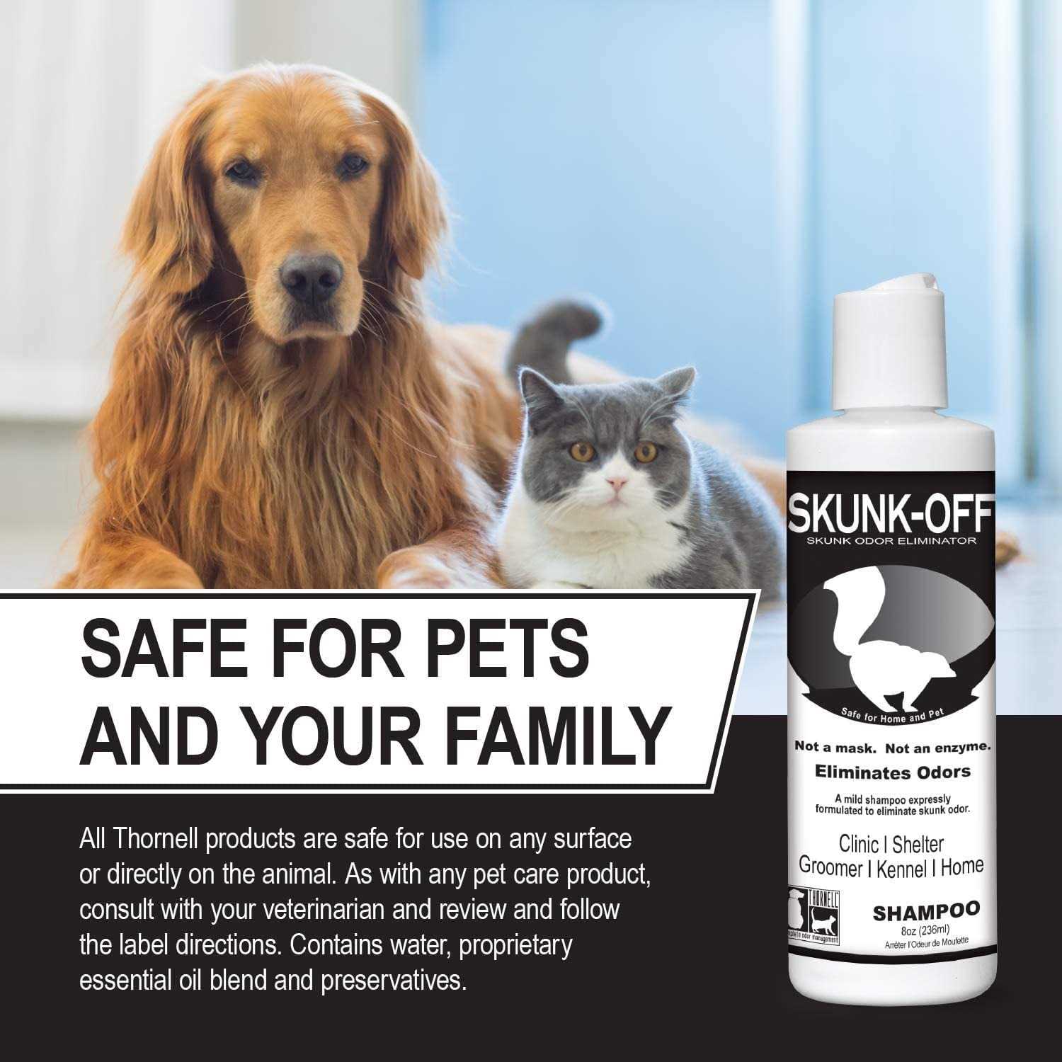 Mild. tearless. baby shampoo plus deodorizing components expressly formulated to eliminate skunk odor. Works chemically through bonding. absorption and counteraction.Stops skunk odor instantly and permanently on contact. Removes all traces of skunk spray from dogs. other pets. people. cloths. cars. homes. anybody or anything a skunk has sprayed or anything a skunk-sprayed animal has rubbed against. Safe. will not damage or irritate sensitive tissue of eyes. ears or nose. Shampoo is thoroughly applied to the entire animal and then rinsed.