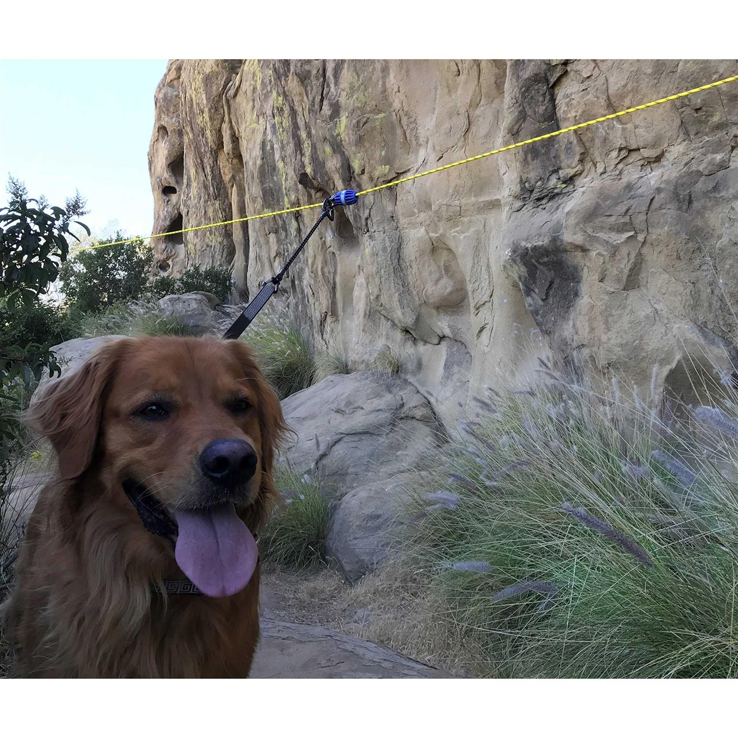 Tested for durability and safety, the Rover Roamer Sky Track maximizes your pets roaming area in outdoor environments. Great for camping but also useful for behavior management for chewing, digging, and runaway dogs. Customizable arrays. Set up your track system anywhere you want your dog to enjoy more room to roam: picnics, parks, and events; acclimating to new environments; and restricting access to provocative flower beds and chewable outdoor furniture. Highly visible phosphorescent (glow-in-the-dark), reflective 8mm heavy-duty lifeline.